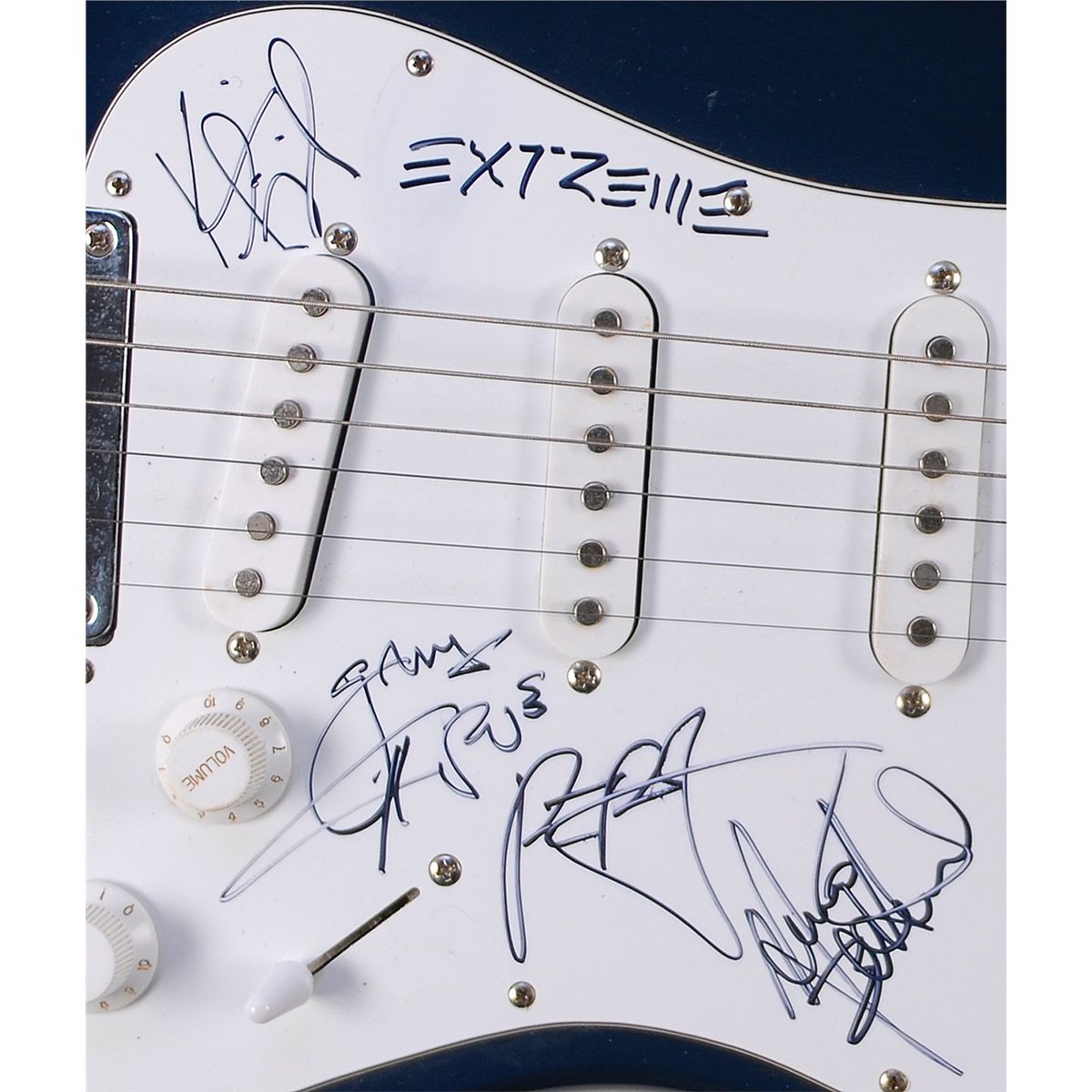 Dark blue-bodied Fender Squier Bullet ‘stratocaster-style’ electric guitar, signed on the white pickguard in black felt tip by Gary Cherone, Nuno Bettencourt, Kevin Figueiredo, and Pat Badger. Some scattered light surface marks to body, as well as a couple of chips, otherwise fine condition. Oversized.