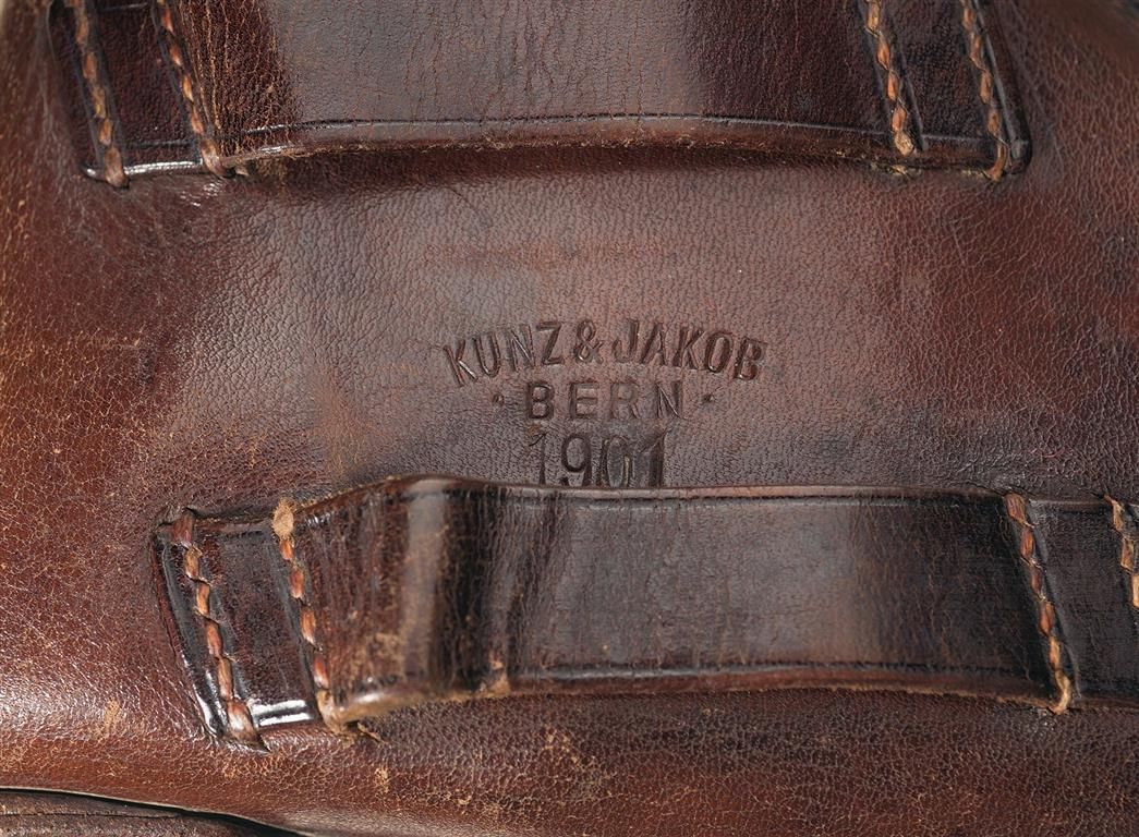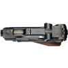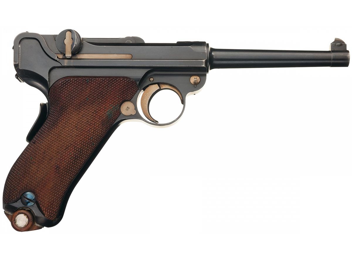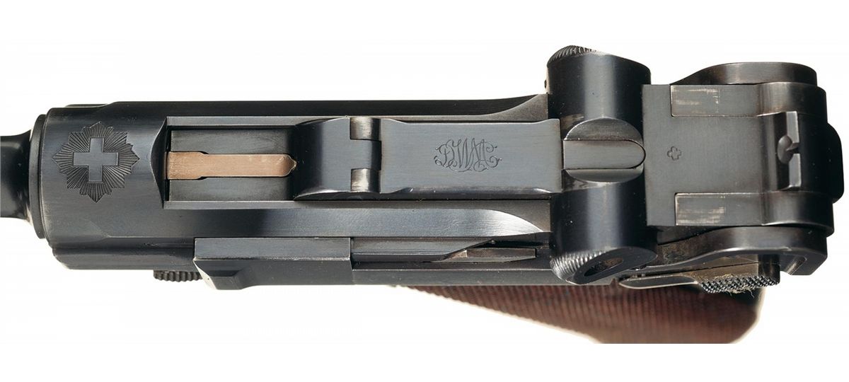 This is an attractive example of a very early production DWM Model 1900 Swiss Contract Luger with the relieved frame. These Lugers represent the very first commercial Luger contract pistols that were sold by the DWM factory, as purchased by Switzerland. This pistol has the early dished toggles with toggle lock, a flat/recessed breech bolt, no stock lug, grip safety, early style, larger flat safety lever with coarse checkering, early narrow trigger, flat main springs and fast taper barrel that is 4 3/4 inches long. These pistols all have the "Swiss Cross" in a sunburst on top of the chamber area with toggle marked "DWM". The barrel extension, left side of the barrel, top and back side of the rear toggle all have the small "Swiss Cross" firing/acceptance proof (only) for the Swiss inspector. This example still retains the original unmodified early "V" notch rear sight. The front of the frame and underside of the barrel have the full serial number "128" of the pistol and the various small parts are correctly numbered with the last two digits "28" of the serial number including the back sides of each grip panel. Complete with an original Swiss nickel plated magazine body with unmarked wooden base, small circular discs inset into each side of the base and an original second pattern leather holster. The back side of the holster is marked "KUNZ & JACOB/BERN/1901" and is complete with the original shoulder straps.