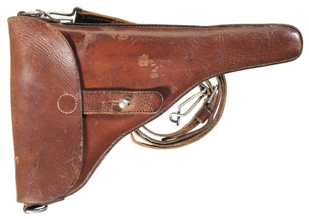 Very fine with 95% plus of the of the armory blue finish overall with edge and high spot wear. The various small parts retain 98% of their straw colors. The grips are excellent with nice original sharp and checkering. Matching numbers except for the magazine as noted. The holster is also near excellent with nice medium brown color with tight stitching and clear distinct markings.