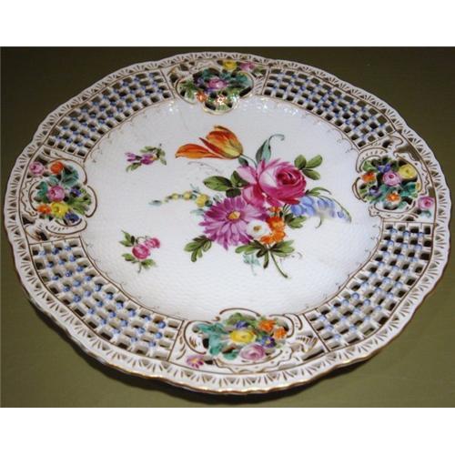 I am offering for sale a hand painted masterpiece in porcelian. This remarkable plate is made of hard paste porcelain. The white basketweave background has a huge "Dresden Flowers" bouquet in the center. Four cartouches with cut florals alternate with square reticulated blue beaded panels. There is a scalloped cut edge. All areas are highlighted with gold. 8 1/2" diameter.