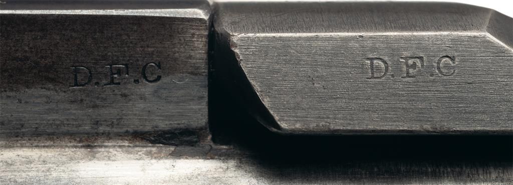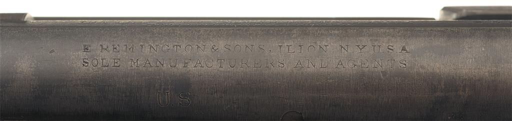 This is a nice example of a rare Model 1882 U.S. Contract rifle. Only about 1,000 Model 1882 Lee rifles were manufactured for the military. The rear sight, buttplate and barrel bands were furnished by Springfield Armory. The left side of the receiver is marked "E. REMINGTON & SONS. ILION. N.Y. U.S.A./SOLE MANUFACTURERS AND AGENTS/US", "THE LEE ARMS Co. BRIDGEPORT, CONN. U.S.A./PATENTED NOV. 4TH 1879" is marked on top of the left receiver rail along with the serial number. "U.S." and "V/P" are marked on the left rear of the barrel and "D.F.C." on the left rear flat. The rear sight is stamped " R L" on the left side. The magazine is unmarked. Casehardened receiver, with blue on the remaining parts and mounted with a full straight grip walnut stock with two barrel bands, steel forend cap and carbine style buttplate. The buttplate tang is marked "U.S.", the top of the comb at the buttplate is stamped with the issue number "I.D.P. / 72" and directly behind the trigger guard is U.S. military inspector stamped "D.F.C./P" (David F. Clark, also inspected U.S. Colt Cavalry Single Action Armys). Complete with the correct cleaning rod.