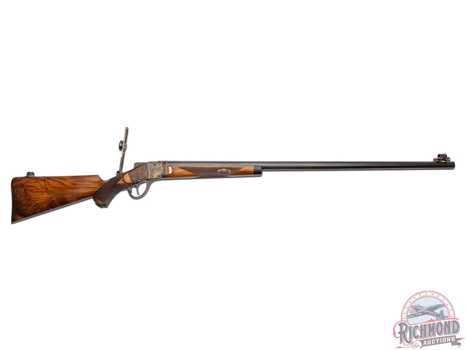 This rifle was one of 65 made for the New York Central Schuetzen Corps of New York City between 1877 and 1878, according to Sharps Firearms book. Originally designed and conceived by Charles Overbaugh who at the time was a Sharp's salesman, Overbaugh then pitched the idea to Christen F. Gennerich of the New York Central Schuetzen Corps who then through Overbaugh preceded to order roughly 65 in all with this one listed in Sharps Book Volume III by Roy Marcot, Ron Paxton and Edward Marron Jr. on the order dated February 13th, 1878 (listed on page 112 Sharps Book Volume III). Rifles were built with a specific request from Gemmerich which included a 30" lightweight blued octagon barrel. Barrel measures 1" across flats at muzzle. Barrel is unmarked with sporting Globe front sight, no rear sight and a mid-range tang Vernier sight. Case-hardened 1874 action with double set trigger control. Plain walnut pistol grip stock with cheekpiece. Stock is fitted with nickel plated Schuetzen butt plate with hard rubber grip cap. Matching plain walnut Schnabel forearm with mark from add on clamp type palm rest. Comes with factory letter confirming all options. Provenance: Michael Rector Collection CALIBER: 40-50 1-11/16. S/N: 162222. FFL STATUS: Antique.