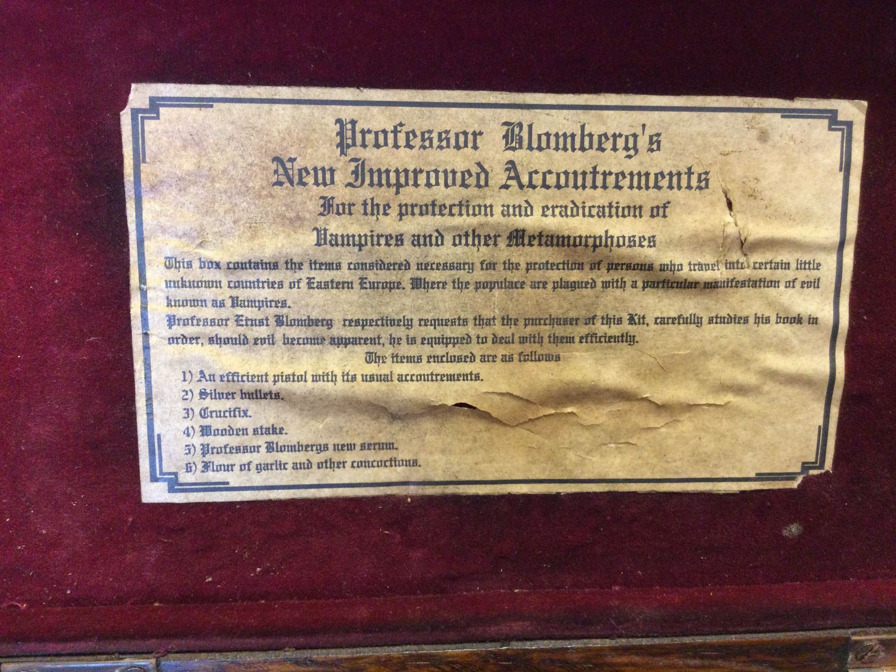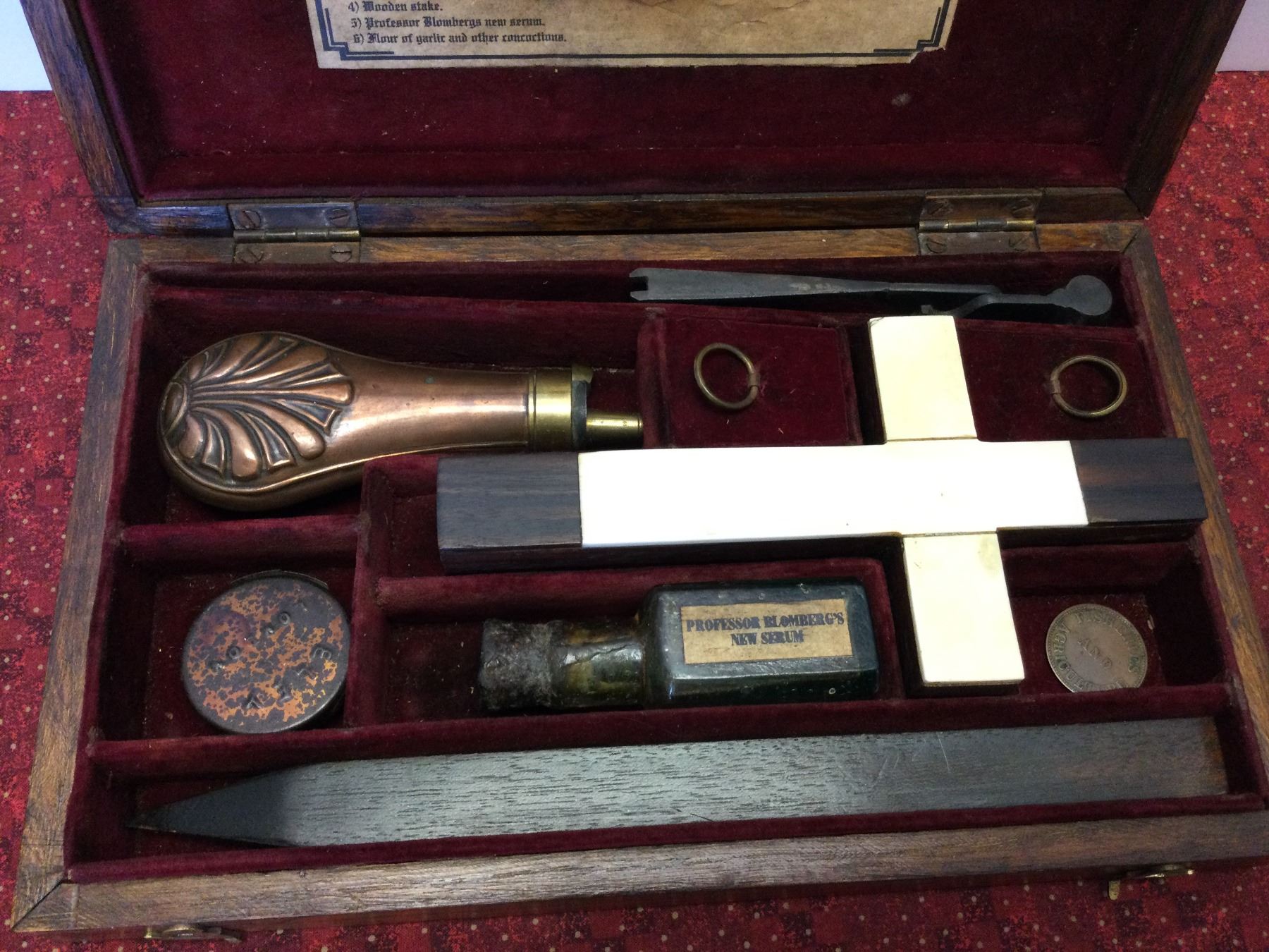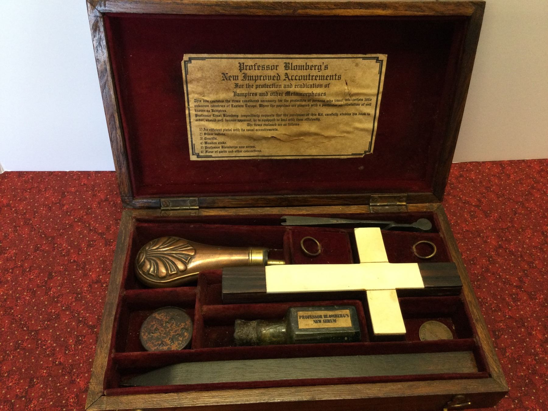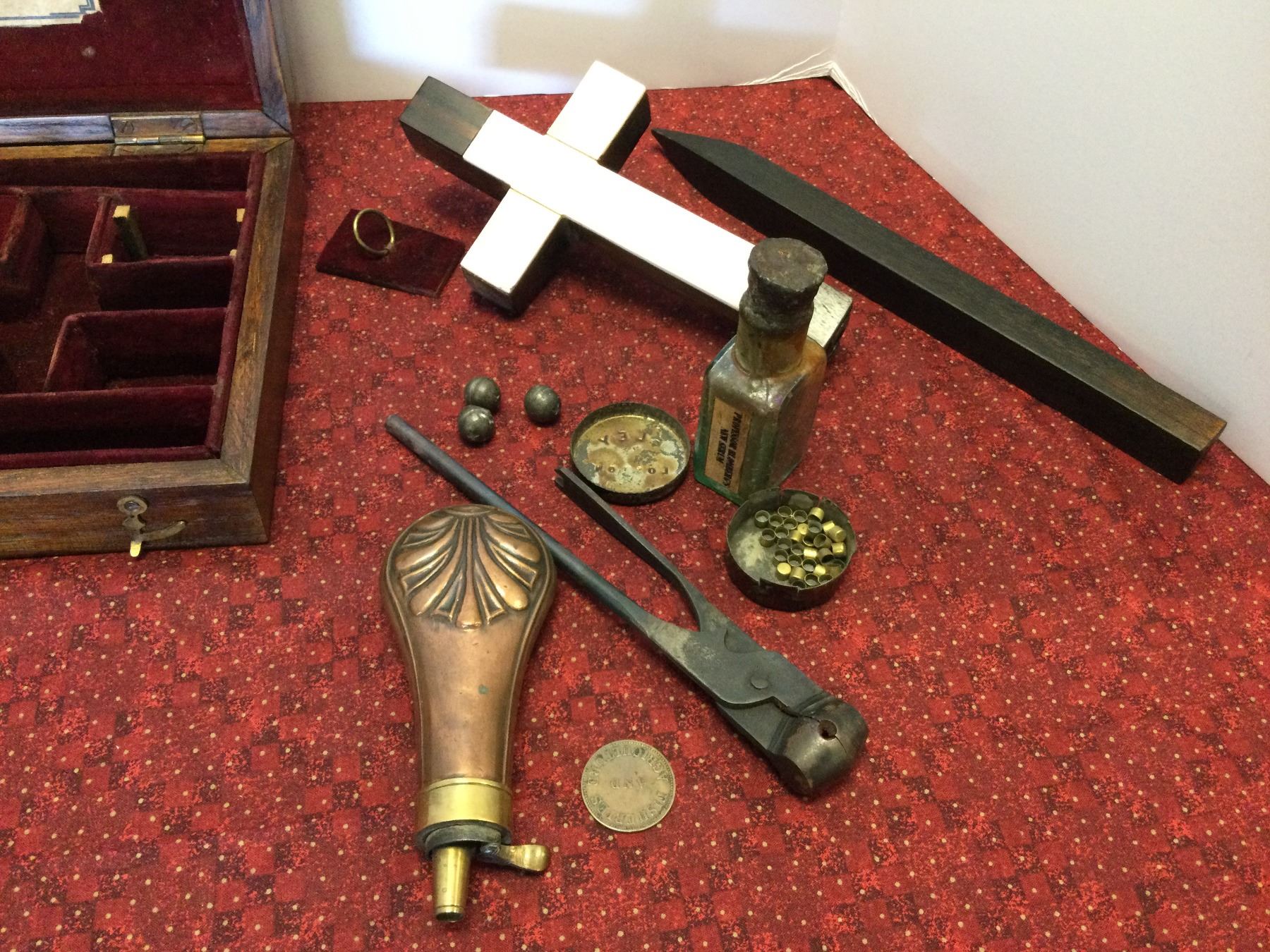 You are bidding on a RARE 1855 Vampire Kit consisting of the Cross, Gun, Powder Flask, Stake, Bullet Mold, etc Beautiful cased, and in fabulous overall condition. Showing a wonderful warm Patina of age.