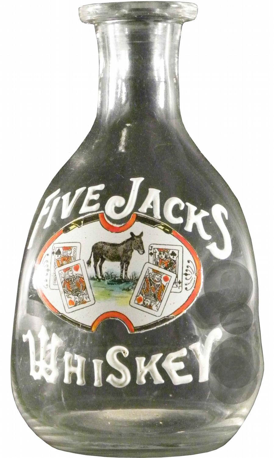 Extremely Rare 5 Jacks Enameled Pinch Bottle. Multi colored enamel with card suit motif. This is the only one of these we have seen. This is a great "Go-With" to the 5 Jacks sign in this auction. No chips or cracks. 6 1/2 inches tall.