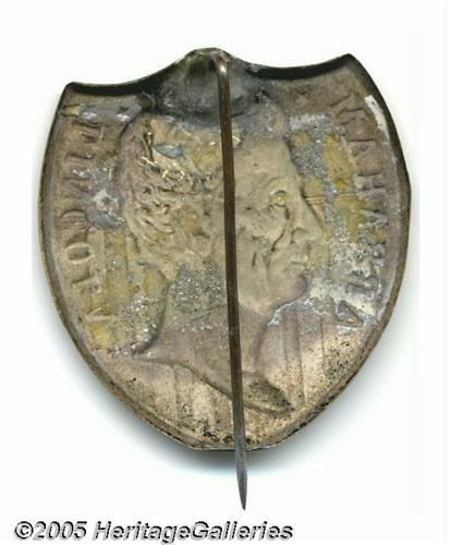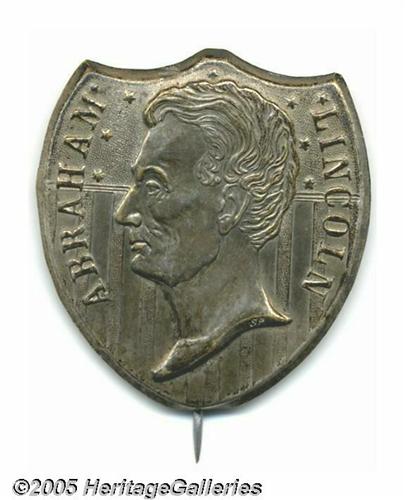 <B>Extremely Rare And Sought-after Large 1860 Lincoln Campaign Badge</B></I> This pinback made of silvered copper shell is listed by Sullivan as AL 1860-27, but we cannot recall ever having seen one offered at auction, and this item is near the top of some of the hobby's most sophisticated want lists! Fairly high-relief Lincoln profile is superimposed over the top portion of a shield. Original pin on reverse. Choice condition and another top prize from the former Joe Brown Collection. 35 mm x 39 mm. Lot:257