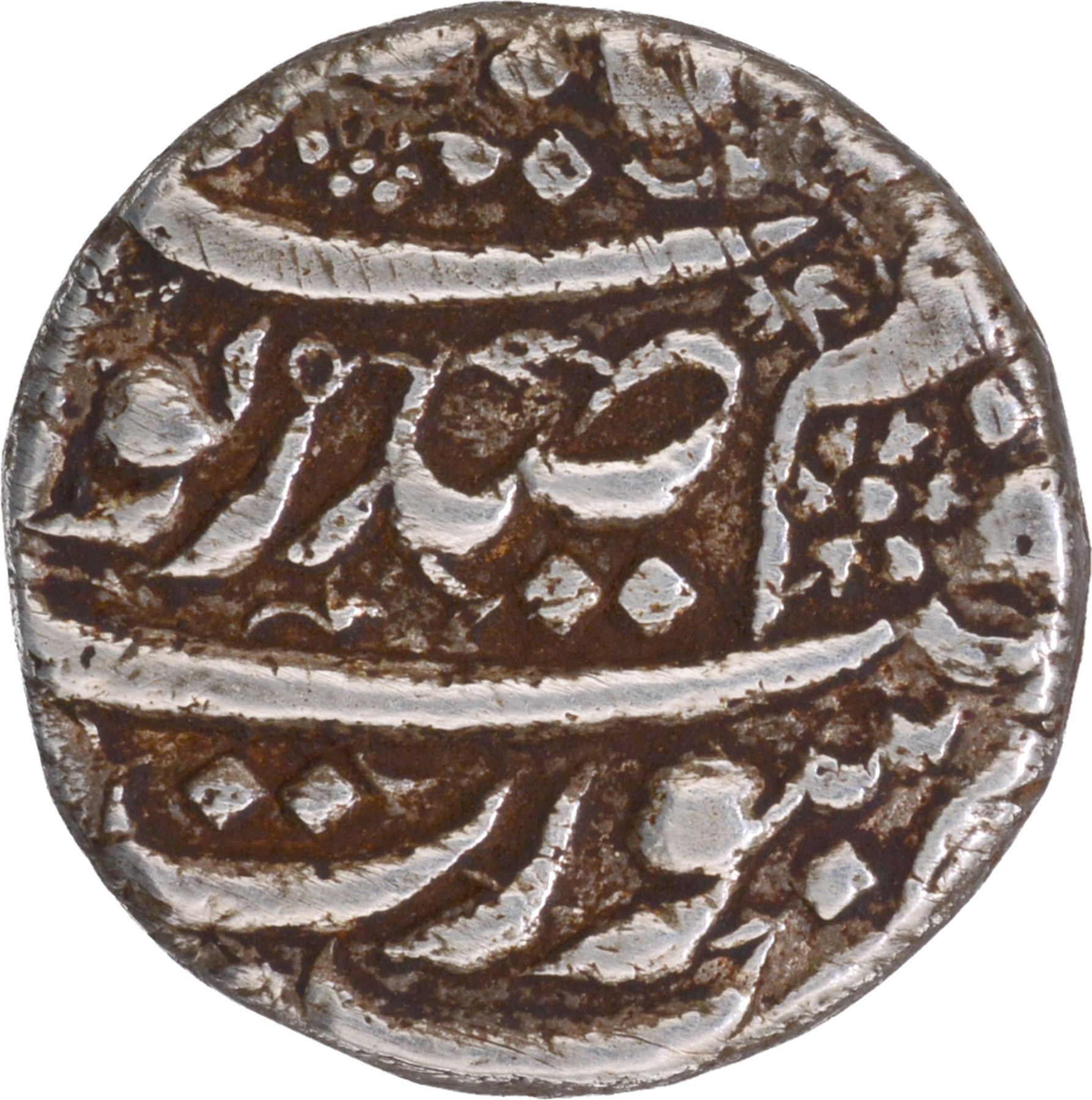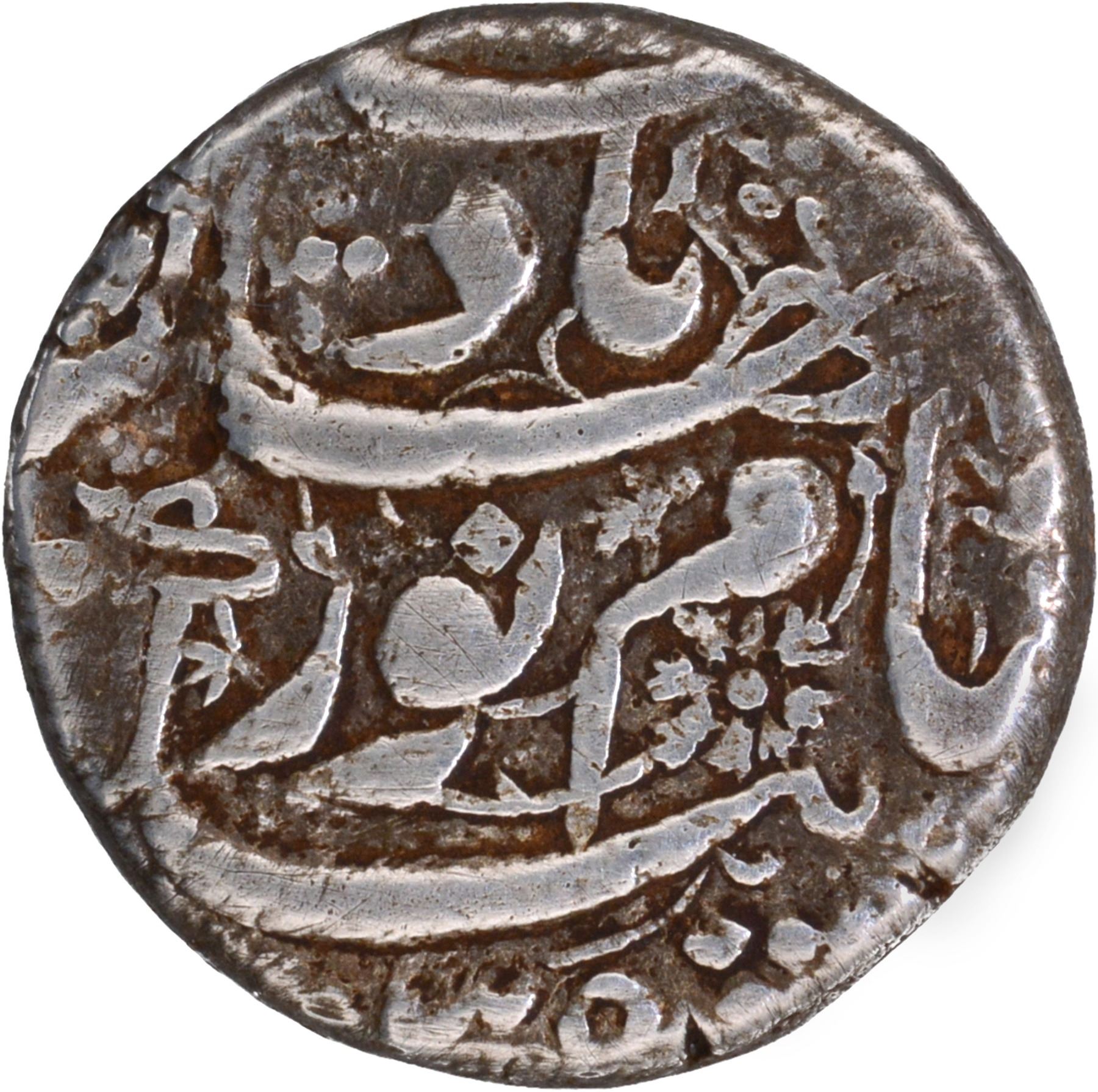 Noorjahan (AH 1033-1037/1623-1627 AD), Surat Mint, Silver Rupee, AH (10)35, Sad Zewar Couplet, Obv: Persian legend bahukam shah Jahangir yaft sad zewar zarb Surat at the bottom, Rev: Persian legend zeNaam Noorjahan Badshah Begum zar the Hijri year (10)35,5.43g, 17.14mm, (KM # 167.2), test mark, choice very fine, Extremely Rare.