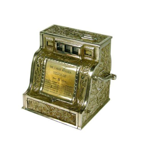Extremely Rare Caille Register Slot Machine. Sometimes referred to as the BANKER. This little beauty is in excellent condition except there is no back. One of only 3 that we know of. 8 x 7 1/2 x 6 1/4 inches.