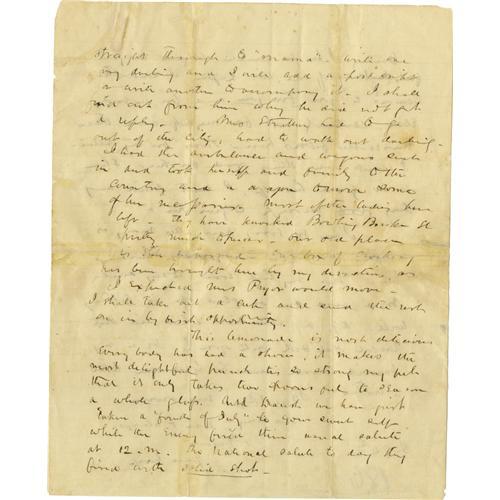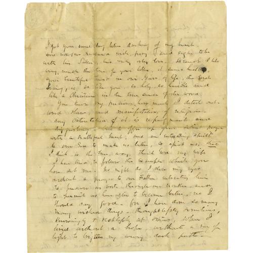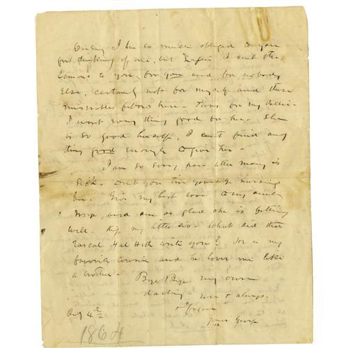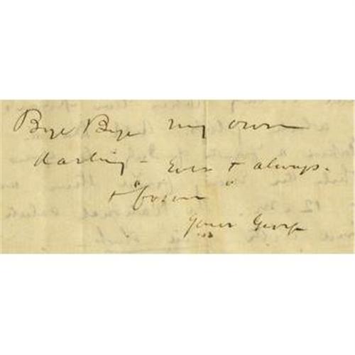<B>General George Pickett, Extremely Rare Civil War-dated Autograph Letter Signed to His Pregnant Wife, LaSalle "Sallie" Corbett Pickett,</B></I> 4 pages, 8" x 9.75", from the Howlett Line during the Bermuda Hundred Campaign, July 4, 1864 . He pens, in part: <BR><BR>"<I>I got your sweet long letter darling of my heart. does not your husband wish, pray and sigh to be with his Sallie, his only only love. Dearest I like very much the tone of your letter, it seems healthy, your bountiful trust in our Giver of life, the Great Being, is so like you, so holy, so humble and like a Christian in the true sense of the word.</B></I> <BR><BR><I>You know my precious, how much I detest outward show, and manifestations of religion - any ostentation of it is unpleasant and disgusting - but it offers up your silent prayer with a truthful heart, and as untrusting spirit to our God to make is better, to assist us, that I think is the true way. Thank God my wife I have tried, to follow the example which you have set me. No night do I close my eyes without a prayer to our Father enlisting him to preserve us both through our troubles, and to permit us hereafter to becomes better, no i should say good - for I have done so many wicked things - thoughtlessly sometimes, knowingly & recklessly at others, when I lived without a hope, without a ray of light to brighten my weary dark path, ho changed my feelings, how soothed and softened my heart and finding my Treasure. <BR><BR>Darling to not let me retrograde into darkness - without you life would be </B></I> ? <I> to soul and body - i could not live. </B></I><BR><BR><I>Oh my own wife, keep up in every way (if you love me as I know you do) tho' your husband cannot come to see you, know you have his heart, his every thought, you know his anxiety greater for you than all his other anxieties and God knows they are sometimes great - greater than he could tell for his sake - for our sakes - get the little girl's</B></I> ? <I>up my pet when you do come to have this pain. I feel every confidence my pet and I see you exhibiting the right courage & spirit - Remember dearest love the future hopefully we will both have a brave heart, a good Doctor kind & gentle and a trust in Eve, all will be right my own darling baby, She shall always be my baby shant she?... Auld Dearest we have just taken a 'fourth of july' to your sweet self while the Enemy fired their usual salute at 12 m</B></I> idnight <I>. the national salute to day they fired with solid shot...</B></I>" <BR><BR>Pickett is excessively rare war-dated correspondence, and such a personal missive is particularly desirable. With archival repairs at fold separations, including the addition of paper loss; however ink is very bold and all text remains legible, overall condition is very good.<BR><BR><b>Shipping:</b> Flat Material, Small (<a target="_blank" href="http://www.heritageauctions.com/common/shipping.php">view shipping information</a>)