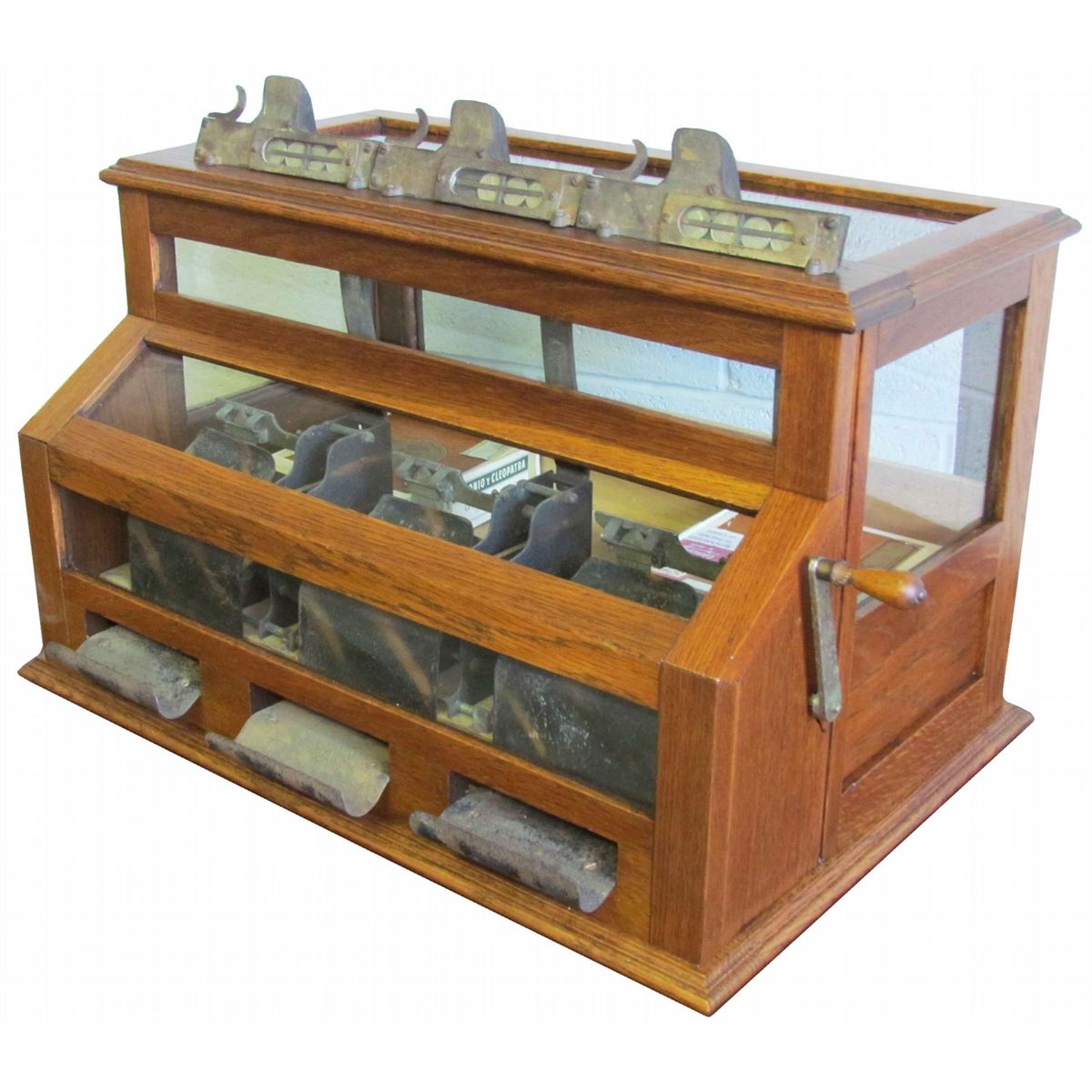 Extremely Rare Coin Operated Cigar Vendor. This is the only one we have ever seen. Turn of the century. 5 Cents dispenses 1 of 3 different kinds. Marquee and mechanism original. Wood cabinet original refinished. Excellent condition. 27 X 19 X 19 inches.
