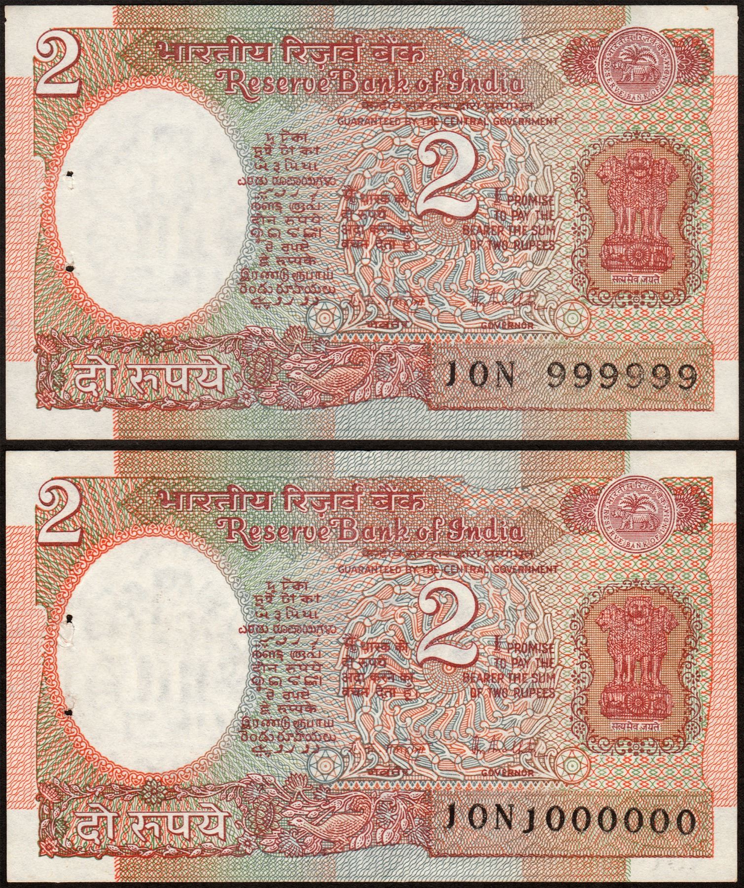 Republic India, 1988, 2 Rupees (2), 999999 and 1000000 (1 Million), Consecutive Pair, Signed by R.N. Malhotra, Plain Inset, N Prefix, S. No. 10N 999999 & 1000000, staple holes at issue, UNC, Extremely Rare.