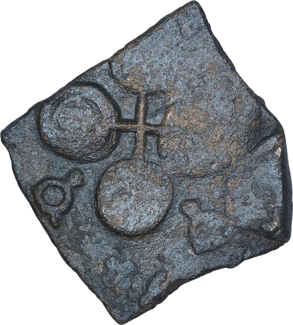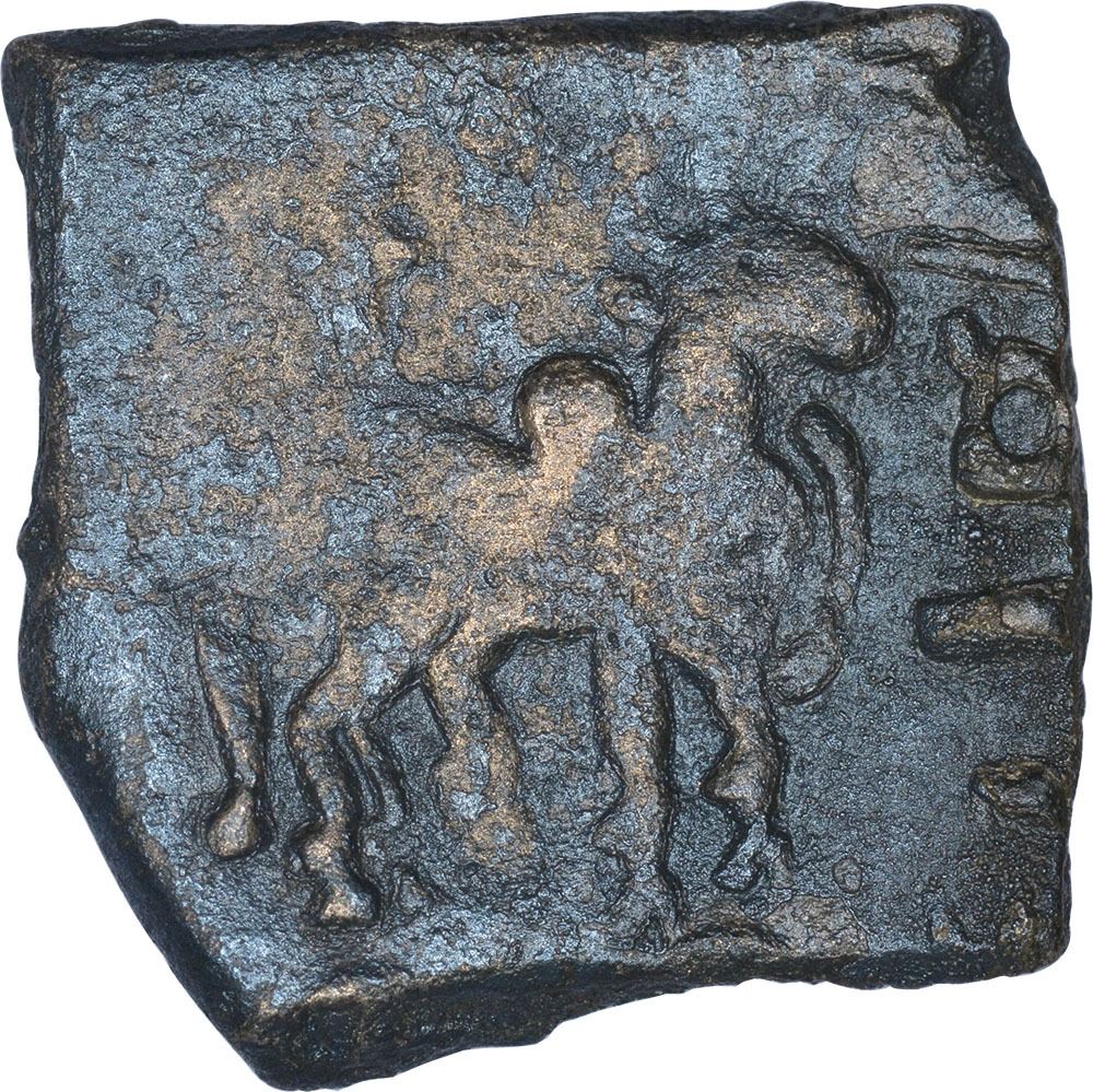 Bhadra Mitra Dynasty, Kingdom of Vidarbha, Shivajaya (100 BC), Copper Unit, Babhulgaon Region (Yavatmal, Maharashatra), Obv: a humped bull standing facing right, brahmi legend in vertical infront ‘ sivajaya’ from bottom to top, Rev: ujjaini symbol, nandipad, svastika in between arbs, 4.36g, 17.84x17.81mm,Unlisted, New Variety, about extremely fine, Extremely Rare.