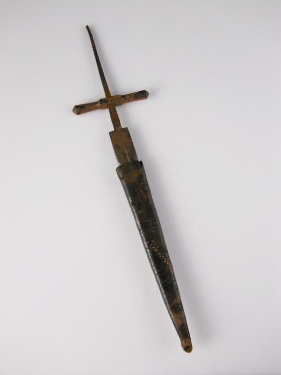 Extremely rare, Italian, Cruciform griped Crusader's dagger amazingly retaining its original scabbard. Eleven inches overall with 6 1/2 " double edged blade. One of very few period daggers that are not battlefield relics and with period scabbard.
