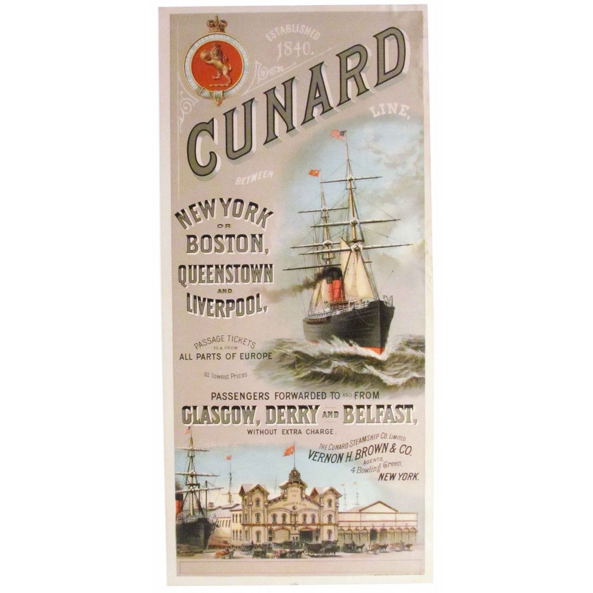 Rare Cunard Cruise Ship Lines Paper Sign displaying Pier 40 at New York Harbor. Vernon H. Brown & Co., NY. The Manor & Knapp Litho Co. NY. Travel between New York and Boston to Queenstown and Liverpool. Small tears at top right and right center, otherwise Excellent Condition. 13 X 27 inches.