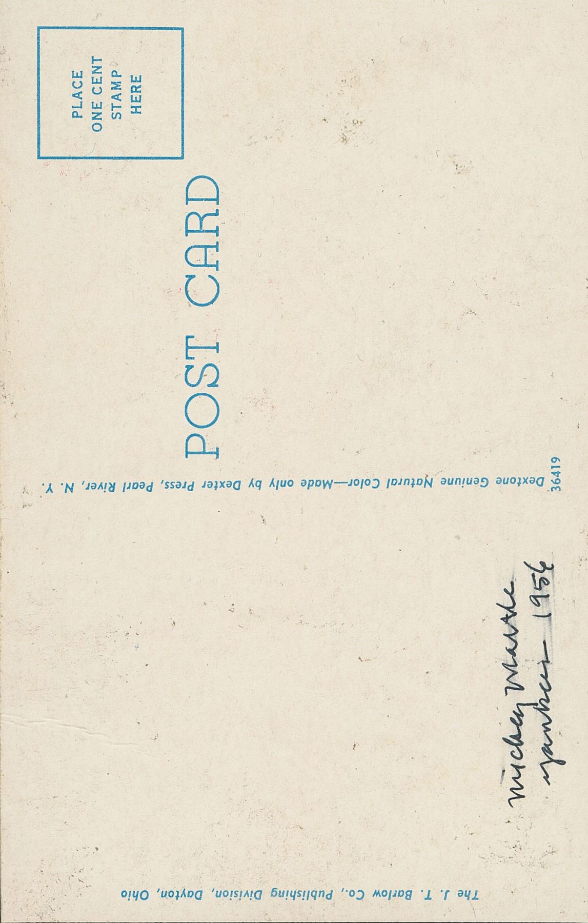 Extremely rare Dexter Press postcard of Mickey Mantle wrapping his legs before a game. This postcard was apparently pulled from the set of postcards issued by Dexter Press due to this image of an injured Mickey Mantle, which the New York Yankees had objected. The obviously worn Mantle, is shown wrapping his oft injured leg in an ace bandage prior to a game. The reverse is the usual Dexter Press postcard style with "1956 Mickey Mantle" written in black near the bottom. While Dexter Press did not issue cards in 1956, this was an image used from that season, which was Mickey's greatest year. We have shown this card to several Mickey Mantle card collectors/dealers and no one has ever seen an example of this issue, certainly reinforcing the claim of it being pulled prior to being circulated.