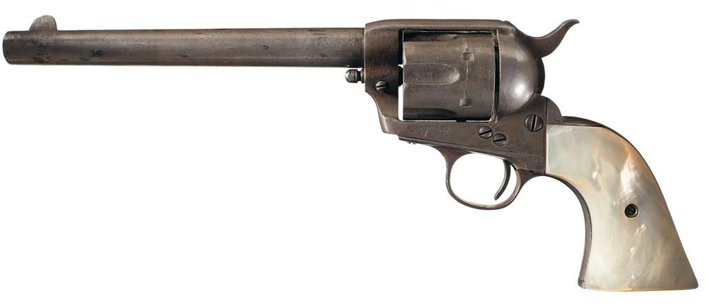 This is a very unique example of a Sheriffs Model Single Action Army revolver with a 7 1/2 inch barrel. The accompanying factory letter verifies the caliber, barrel length, silver finish, grips as "Not Listed" and that it was shipped as 1 to Simmons Hardware Co. C/O W.E. Todd in St. Louis, Mo. On February 15, 1905. The top of the barrel is marked with the one-line Hartford address, the left side is marked "45 COLT" and the left side of the frame is marked with the two-line, three patent dates followed by a very faint remnant of a circled Rampant Colt. The matching serial number is marked on the bottom of the frame, trigger guard and back strap (weak). Standard blade front and frame notch rear sights, and fitted with smooth pearl grips.