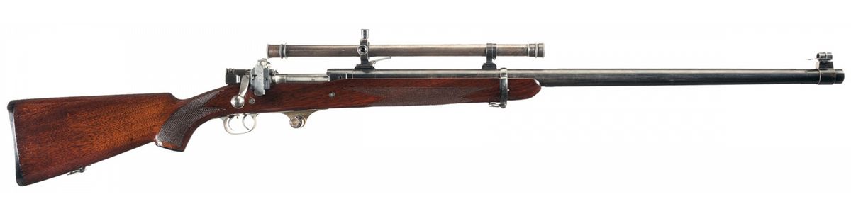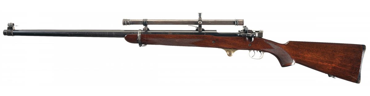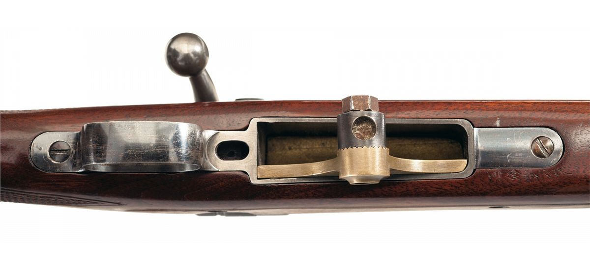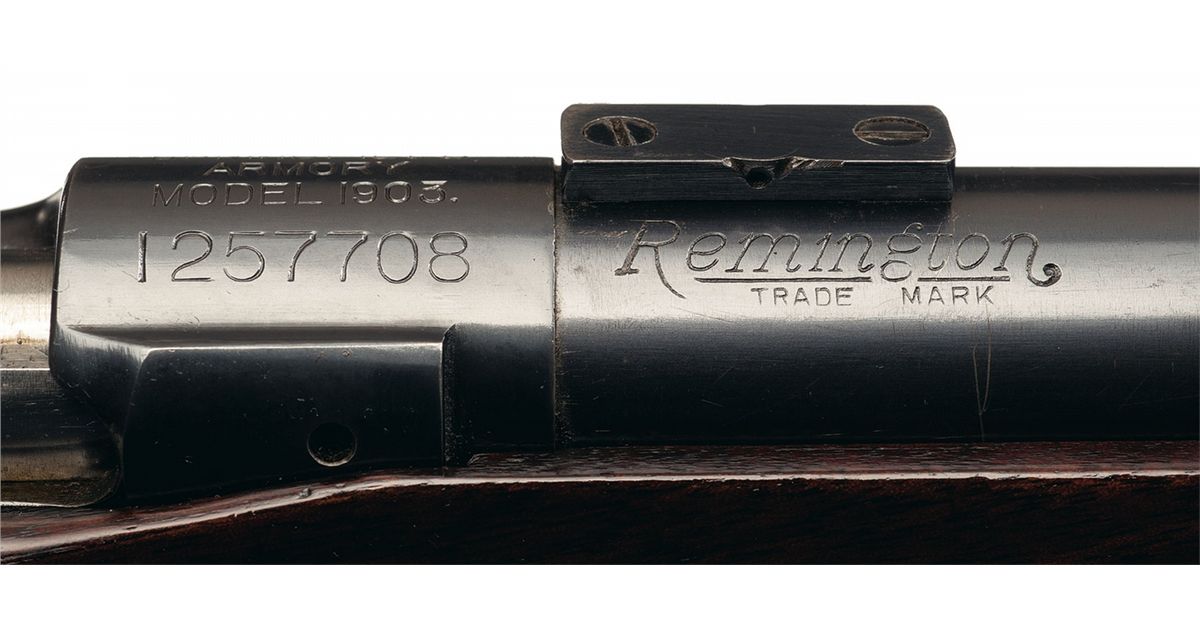 This is an extremely rare,1924 International Match Bolt Action target rifle that was built using the tried and true 1903 rifle action. The genesis of these rifles was that in 1923 the Government solicited several prominent rifle/barrel makers to manufacture select/special rifle barrels and assemble them on 1903 actions, for use in the upcoming 1924 International Rifle matches. In all 40 barreled receivers were received from three different producers; 15 each from Winchester; 5 each from the well known barrel maker H.M. Pope and 20 from the Remington Arms company. All 40 barreled actions were tested by Frankfurt Arsenal for accuracy and out of the 40 candidates, the best 15 were selected for use in the 1924 international rifle matches, with the remaining rifles used for spares and practice rifles. All 40 rifles are recorded by serial number on page 116 of "The Springfield 1903 Rifle" by Lt. Col. William Brophy, of those used for the 1924 International Match Rifles. This specific rifle is listed by serial number, as one of the original "15" best selected for accuracy, when originally built with the 30 inch long, Remington Arms, 1-10 twist barrel. At that time it's prevailed figure of merit was 2.61 inches at 300 meters. This rifle is still fitted with one of the original 1924 International Match, Remington Arms barrels, however it has been shortened to 28 inches and set back. This is consistent with exactly what Springfield Armory did, which is, as the barrel started to wear out and loose some of its accuracy, SA would just shorten the breech end, rethread, rechamber and reinstall it on one of the original 1903 International Match rifle actions. The barrel is marked on the right rear side, in two-lines with the: "Remington Arms/TRADE MARK" legend in front of the receiver. In addition this rifle has one of the rare 1903 trigger guards with the "double set triggers" produced specifically for these 1924 International Match rifles. Also included is one of the brass single shot inserts that was intended to also double as the attachment point for a cork/ball palm rest (now missing). This rifle is still equipped with the original Lyman 48C target rear sight, as well as one of the Winchester A5 scopes, that retains the original Winchester scope mounts, adjustable for windage and elevation, which are installed on Winchester style bases. Additionally the top of the barrel has, two additional sets of scope block holes. It still retains the original "WL3" marked bolt with the headless cocking piece. It is fitted with an original short walnut, pistol grip stock without finger grooves and correct barrel band, with a checkered steel buttplate.