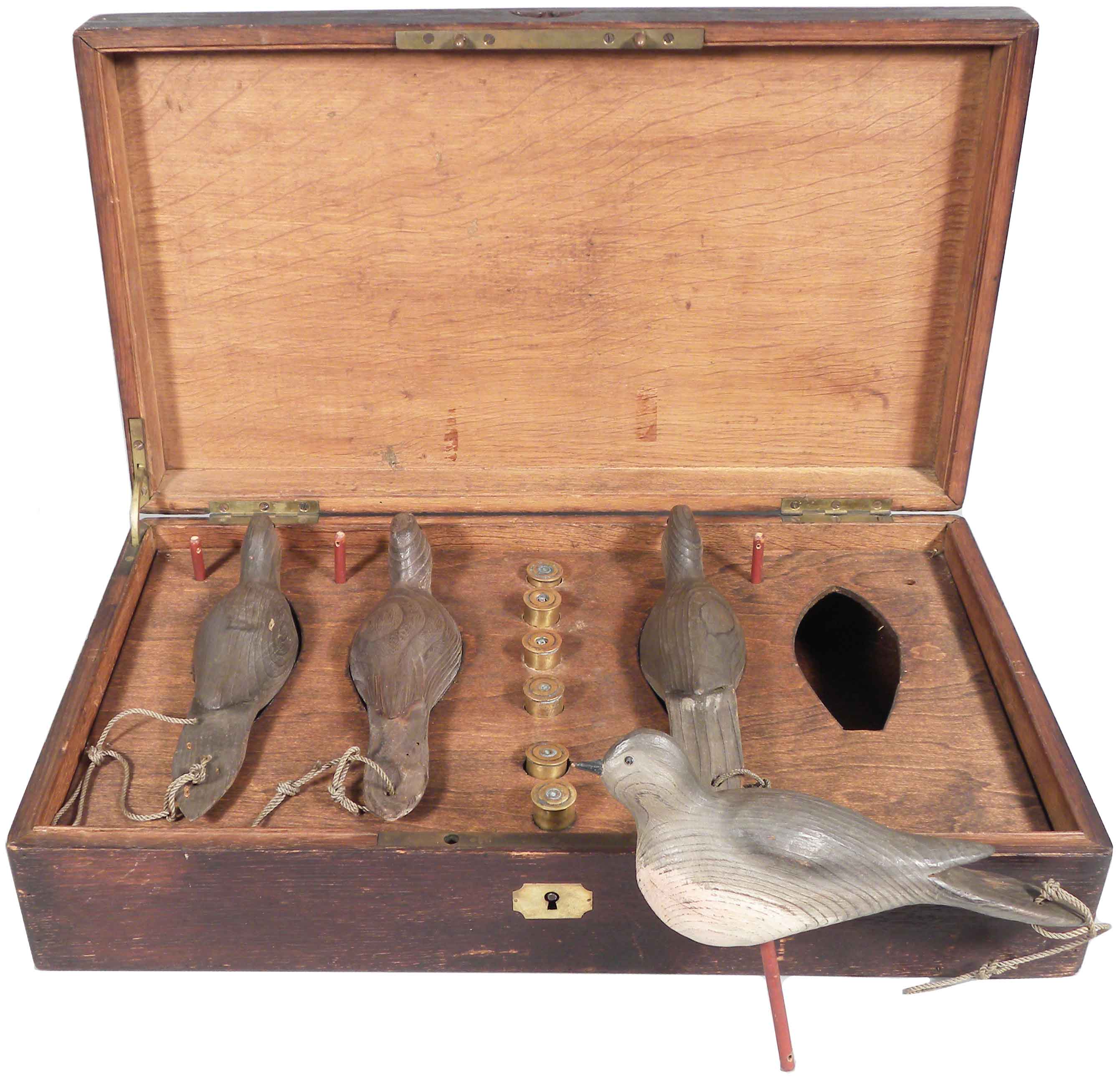 Extremely Rare Dove Decoys in Handmade Chest. 4 doves with 6 shells in custom box. Brass tag and hardware. Excellent original condition. 26 X 5 X 11 1/2 inches.