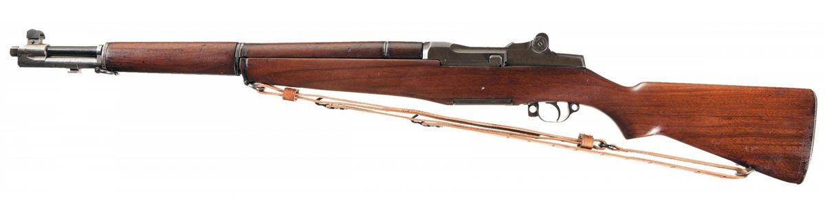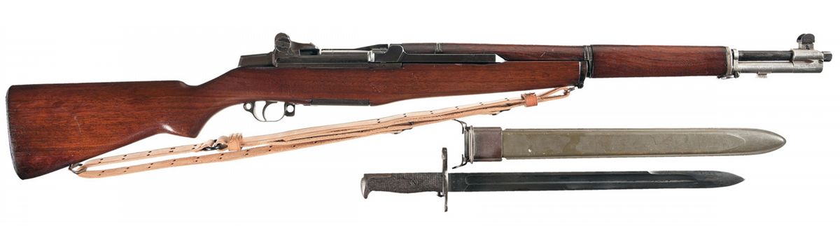 This is an extremely rare example of an early "Gas Trap" M1 Garand manufactured circa June 1938. Developed in 1936-38, they were the first attempts by the US Army to develop and field a semi-automatic rifle prior to WWII. The gas cylinder assembly is the first type commonly known as the "Gas Trap". The barrel is marked with only a "P" proof on the right side towards the front. It has an early production gas cylinder that is marked on the top of the rear barrel ring "D 28289" and the right side of the front sight is marked "B882" with grooves on top of the sight protectors. The operating rod is marked "D 35382-0" on the top and does have the modified cutout, the recoil spring is an original style square edge "Keystone" spring, and it has a correct style square comp spring with the early long type operating rod guide with serrations on the side, without rivets. The bolt is marked "D 28287-1/J 3 B". The trigger housing is numbered "D 28290" without pad, small hole, hammer number "C 46008" (on the side) with hole, safety "C-46015", blue hammer spring housing, trigger guard "C 46025" with rings. The rear sight assembly is marked "B-8868-1" on the rear sight aperture, "B-8872" on the sight cover, and the windage knob is an early checkered pattern (unnumbered) marked "LEFT" and "LEFT" with flared arrows. The elevation knob is also the early pattern that is marked "UP" and "DOWN " and "BATTLE RANGE" with the pointer triangle, closed arrows, and is checkered around the edge (also unnumbered). The middle band is grooved and notched at the bottom (C-46000), the rear handguard clip is grooved, the milled bullet guide is marked "B-8875", and the follower arm is marked "B8869" with 2 bevels. The follower and clip latch are both unnumbered. The stock is an early version with a faint circled "P" proof in the pistol grip. The butt area has 2 unequal holes (one large, one small) without modification under the buttplate and the buttplate is numbered "C-46012" (screws not numbered). The stock ferrule is numbered "B-8899". The receiver is the correct commodified style that has not had the seven shot conversion; very rare! With a leather claw sling and a "S A/flaming bomb/1918" marked bayonet with scabbard marked "USN/MK I".