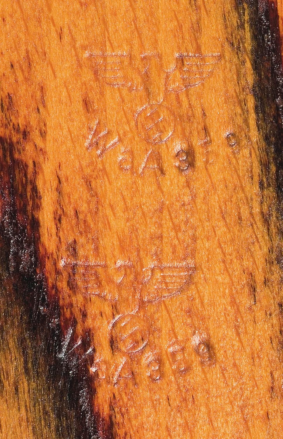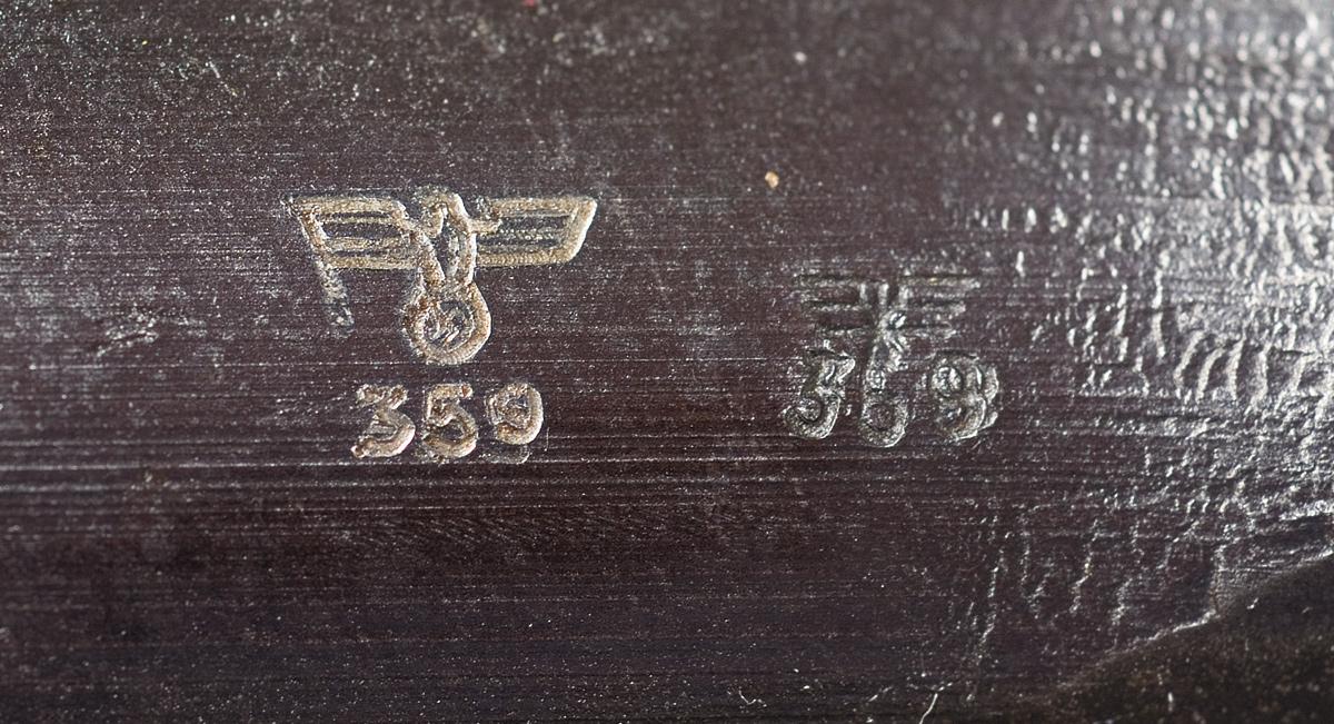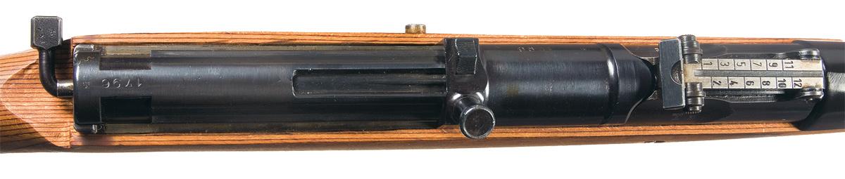 This is a very early production of an extremely scarce G41(W) rifle manufactured in late 1941 or early 1942 by the Walther factory, that utilizes the push button bolt release mechanism found only on these earliest first series of G41 rifles. This push button release is found on the left side of the stock below the bolt carrier and was intended to release the bolt and bolt carrier group after the rifle was loaded. This feature was discontinued in the 7500 serial number range, making these rifles an even more rare of a production variation. Most of these rifles went to the Eastern front when the Germans invaded Russia and good solid original examples are very rare today. It has the all machined parts, with a full-length laminated stock with double WaA359 Waffenamt proofmarks with the black plastic (Phonelic Resin) handguard, another war expedient feature intended to save on the use of wood. These rifles were intended to be the first fielding of a German semi-automatic rifle to increase firepower by the average German soldier over the standard K98 rifle. These early rifles featured the barrel mounted "Bang" gas trap mechanism, with the full length piston rod above the barrel. These early models were the forerunners to the G43 series of rifles but proved too costly to manufacture due to the numerous fully machined parts and certainly not robust enough for long term use. It is estimated that only 10,000 of this version were manufactured before they were changed to the more reliable G/K-43 series of rifles. These rifles have the Type One machined receiver and bolt carrier. The left side of the receiver is marked G 41(W) with the serial number "1796ac" stamped on the upper portion of the receiver below the rear sight with a single German Eagle behind that. Both the left and right side of the receiver and the various component parts have the "Eagle/ 359" proof. The handguard is the early, unnumbered version marked "PAG" inside, indicating manufactured by the Prague Essen Werks, along with a mold number of 2270.