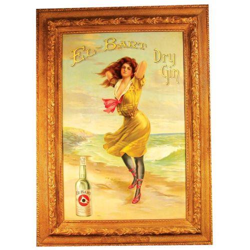 Extremely Rare El Bart Dry Gin Tin Sign, in original gesso frame. By far the best we have ever seen and arguably the best out there. Kaufmann and Strauss Co., Lithographers, NY. Copyright 1905, the Wilson Distilling Co. Excellent condition. 33 1/2 X 45 1/2 overall.