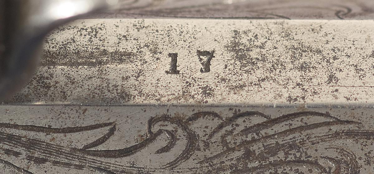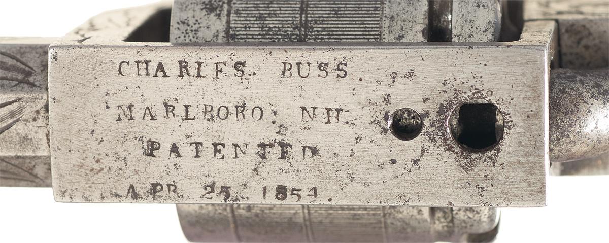 Manufactured by Charles Buss of Marlboro, N.H. circa 1855, with less than 25 produced and only 5 known to exist, including the patent model. Intended to work around Colt's patent, the cylinder is revolved by hand, with a spring loaded "U" shaped block, aka the "straddler" holding the cylinder in place. Single brass bead sight, with "CHARLES BUSS. / MARLBORO, N.H. / PATENTED / APR. 25, 1854" on the top strap, the serial number on the bottom barrel flat, and scroll leaf engraving on the barrel flats, frame and backstrap. This revolver is pictured on page 26 of "American Percussion Revolvers" by Sellers and Smith, which also states that serial number 17 is the highest known example.