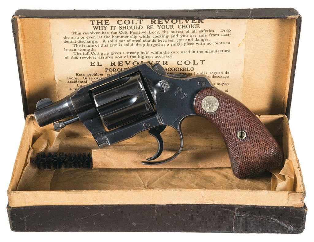 According to the included factory letter, this revolver was shipped to the Em Roe Sporting Goods Company of Indianapolis, Indiana on May 26, 1932, and in addition to documenting the finish and barrel length, the letter notes that the revolver was part of a 25-piece batch that was factory modified with a cut-away trigger guard, bobbed hammer and a rounded butt. This configuration, known as the "Fitz Special" was endorsed by Colt's resident ballistic expert and pitch man J. Henry Fitz-Gerald as an ideal package for concealed defensive carry, with Fitz-Gerald known for wearing a brace of 45 New Service Revolvers so modified. While some of Fitz's concepts (such as reducing/eliminating components that could catch on clothing and an emphasis on double-action fire) are embraced up to this day and still influence the design of defensive handguns, others (like chopping off your trigger guard) are generally regarded as artifacts of another time. Blade front and frame groove rear sights, with the two-line address and patent dates on the right side of the barrel and "38 DETECTIVE/SPECIAL" on the left, with a checkered trigger, smooth spurless hammer, the Rampant Colt on the left side of the frame, and checkered grips with Rampant Colt medallions. Included with the revolver is an unlabeled "black box" with a barrel brush.