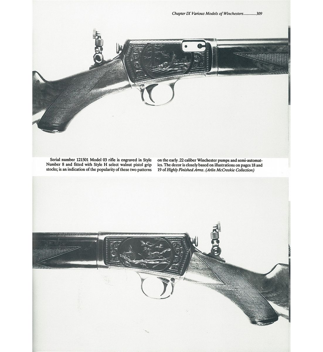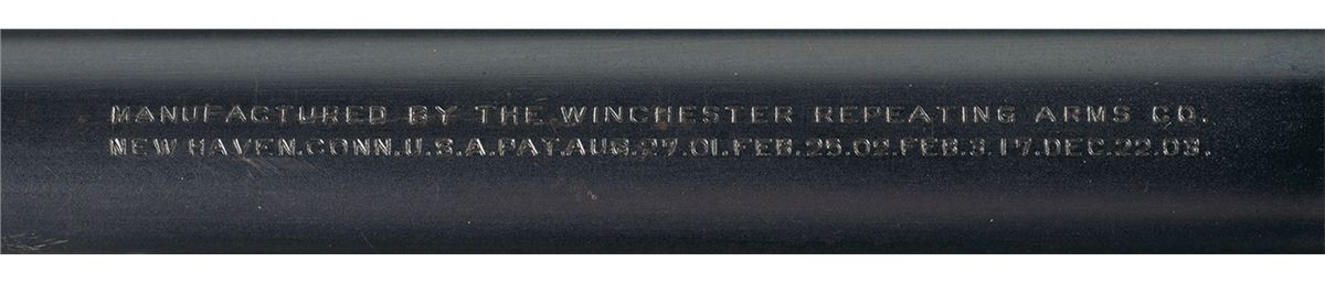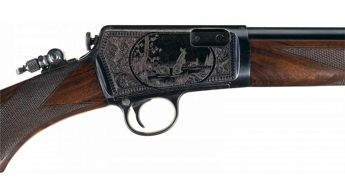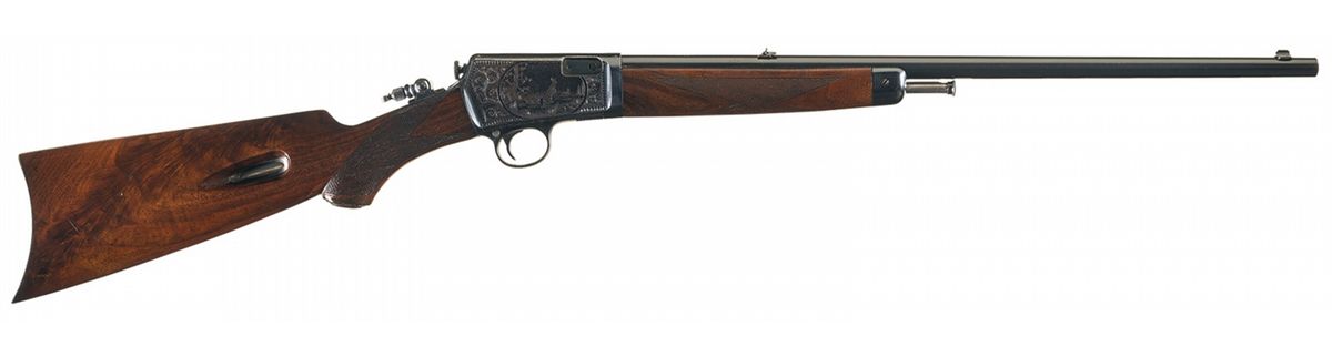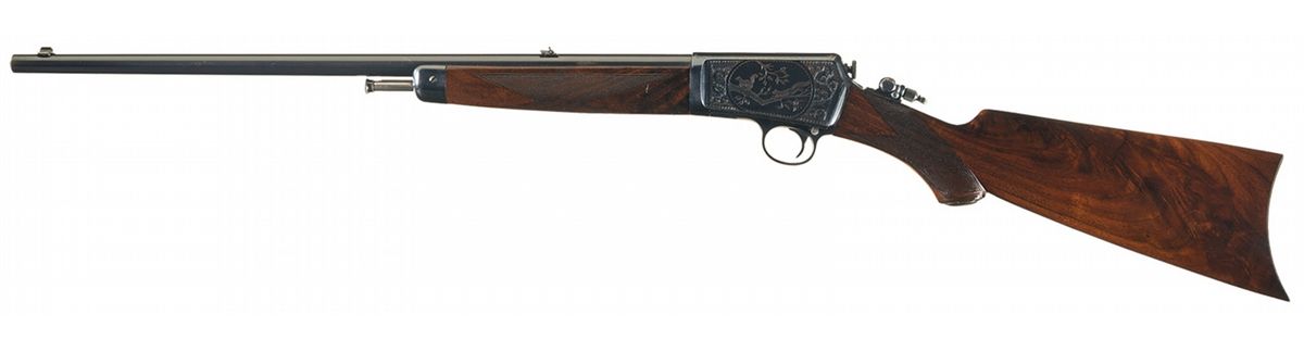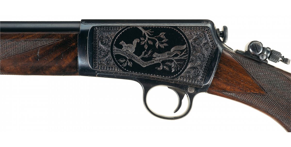 Manufactured in 1912. The top of the barrel is marked with the two-line address/patent dates ahead of the rear sight and "-WINCHESTER-TRADE MARK-/MOD. 1903 .22CAL. AUTOMATIC" at the breech. The Winchester oval proof is marked on top of the barrel and receiver at the breech. The receiver is very nicely engraved with animal scenes of two squirrels on a tree branch on the left side and three rabbits in a field scene on the right side. Both are in oval panels surrounded by floral scroll designs. Dovetailed, Lyman blade front sight with an ivory bead, two folding leaf rear sight and a tang mounted short range peep sight. All blue finish and mounted with a multi-point checkered deluxe walnut forearm with a steel forend cap and pistol grip stock with a hard rubber grip cap and crescent buttplate.