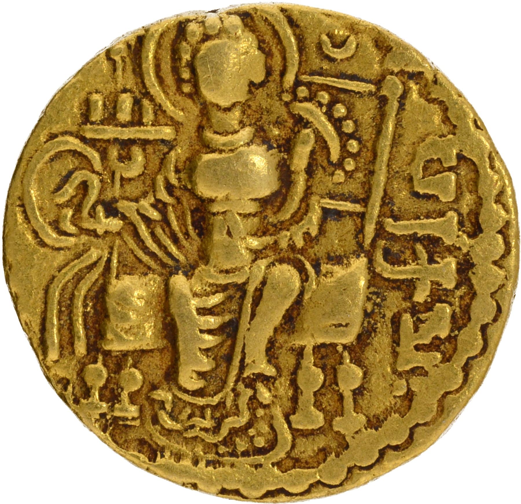 Gupta Dynasty, Samudragupta (335-370 CE), Gold Dinar, “Scepter/Standard” type, Obv: the king standing facing left, nimbate, holding the royal scepter (Rajadhanda) in his left hand and sacrificing over an altar, a filleted Garuda standard in the left field, the Brahmi legend “Samudra” below the king's arm, a circular Brahmi legend “Samarasativitata(vijayojitari…)” around the field, Rev: the goddess Lakshmi, nimbate, seated on a high backed throne whose four legs are clearly visible, with her feet resting on a circular mat below, a diadem and a cornucopia in her hands, a tamgha in the top-left field and a crescent on the top-right, the Brahmi legend “Parakramah” in the right field, a dotted border around the field, 7.40g, 19.36mm, (Unlisted in Altekar/Variant of TGE, S. Kumar # Class II -Var. C.5.2), choice very fine, Extremely Rare.