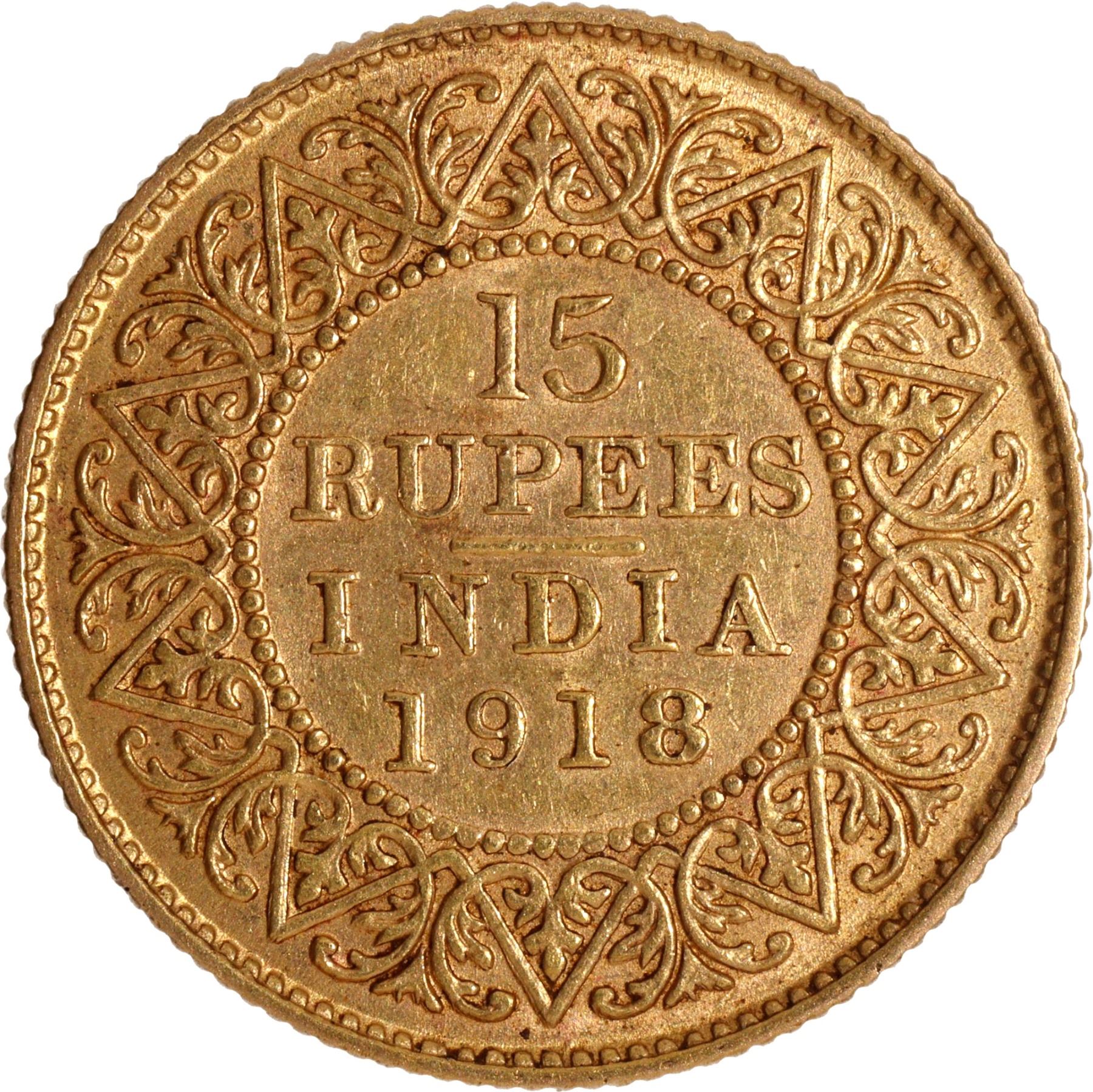 1918, King George V, Gold 15 Rupees, Bombay Mint, value side same as the design of the Victorian TEN RUPEES of 1870 with year corrected, (PR # 25/S&W # 8.1), 22.24mm, 8gm, nice quality, XF-AU, Extremely Rare.