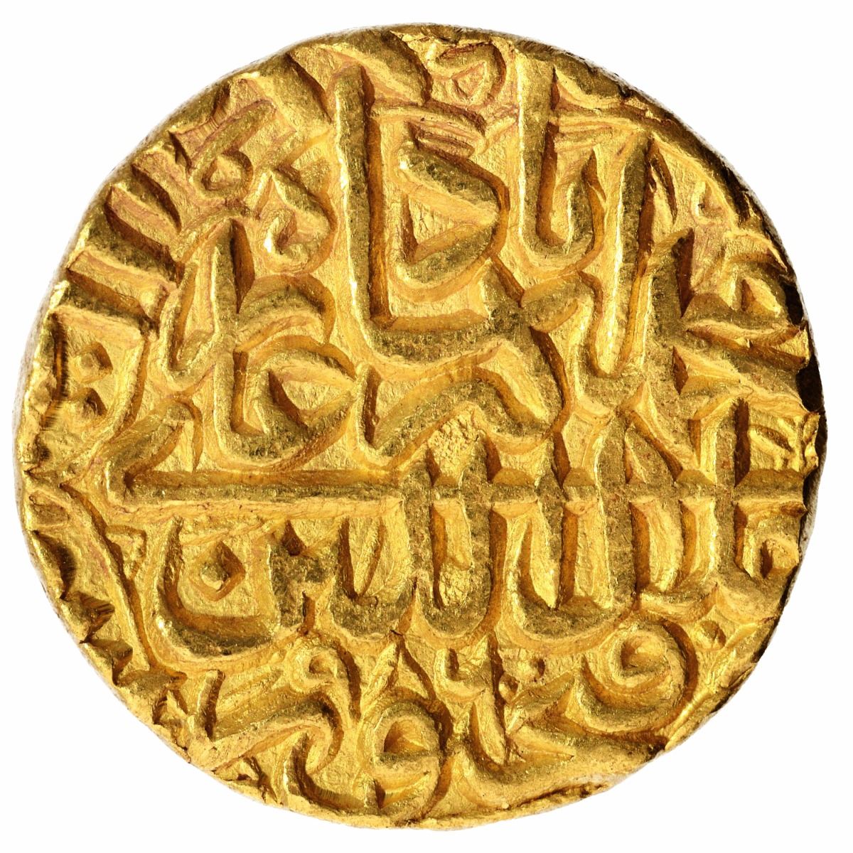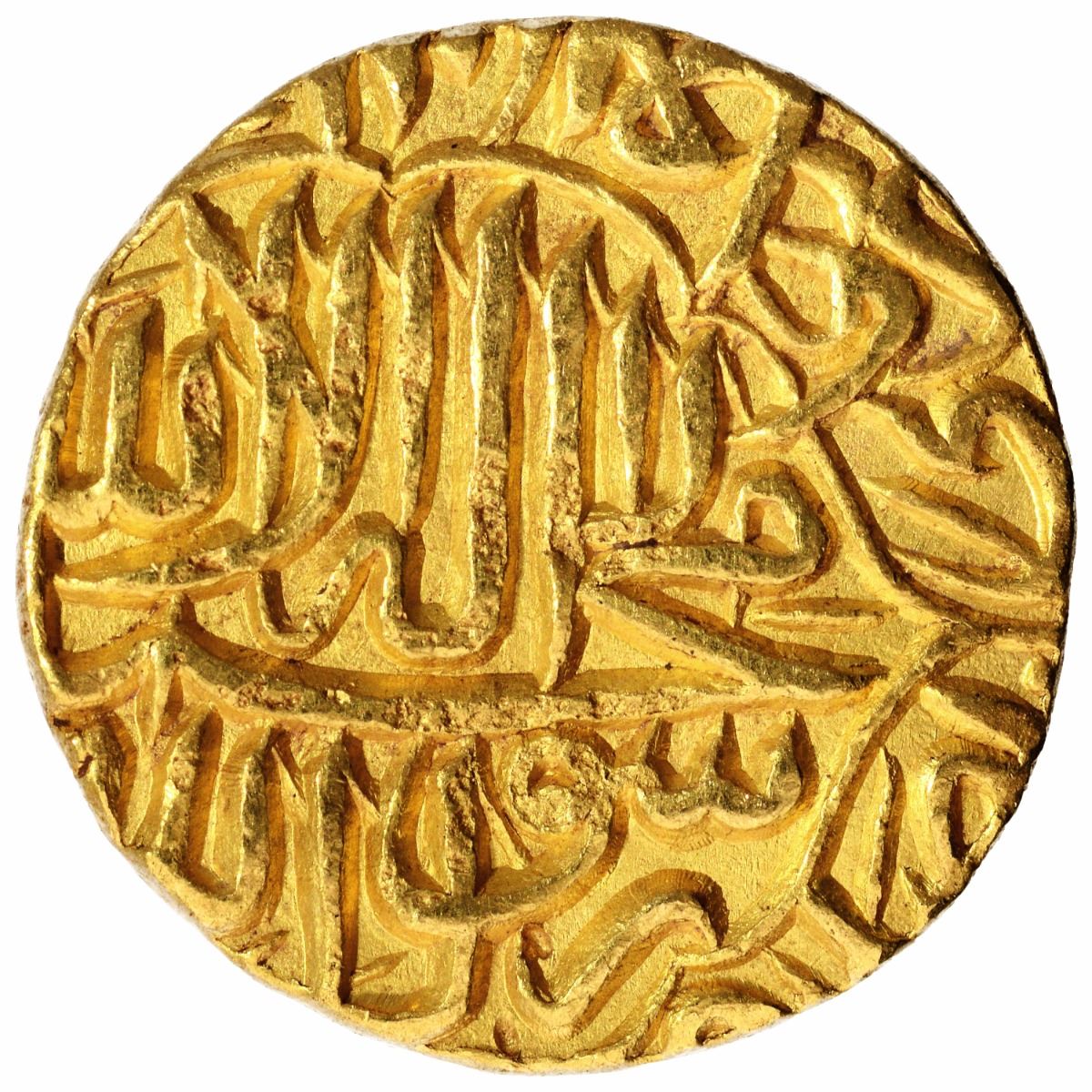 Akbar, FathpurMint,Gold MohurAH 986, Kalima Type,Obv:kalima shahada around four khalifas name,Rev:jalal-ud-din muhammad akbarbadshah ghazi,10.84g, 21.81mm,(KM # 110.1), complete mint name fathpur visible at bottom,about extremely fine, Extremely Rare.
