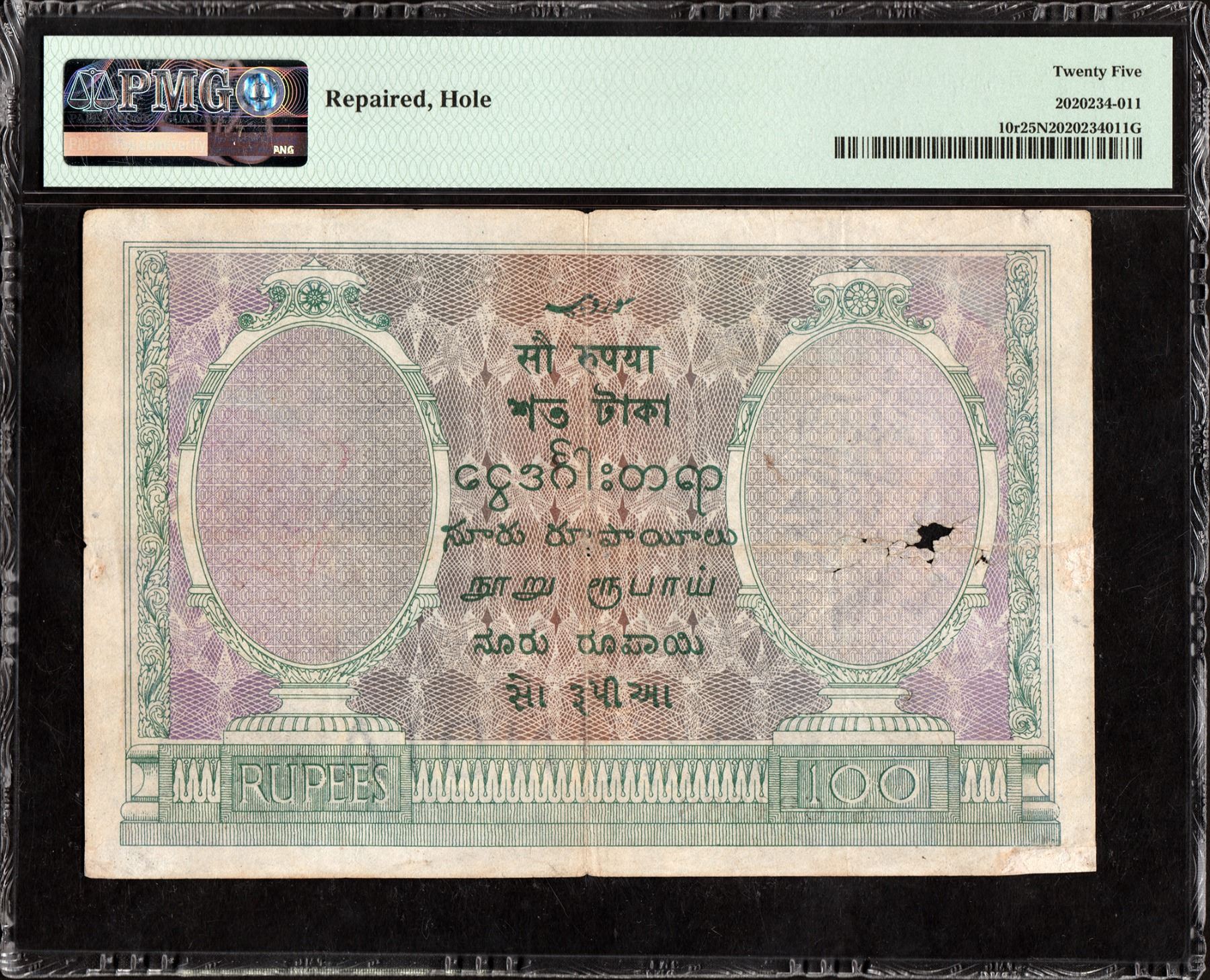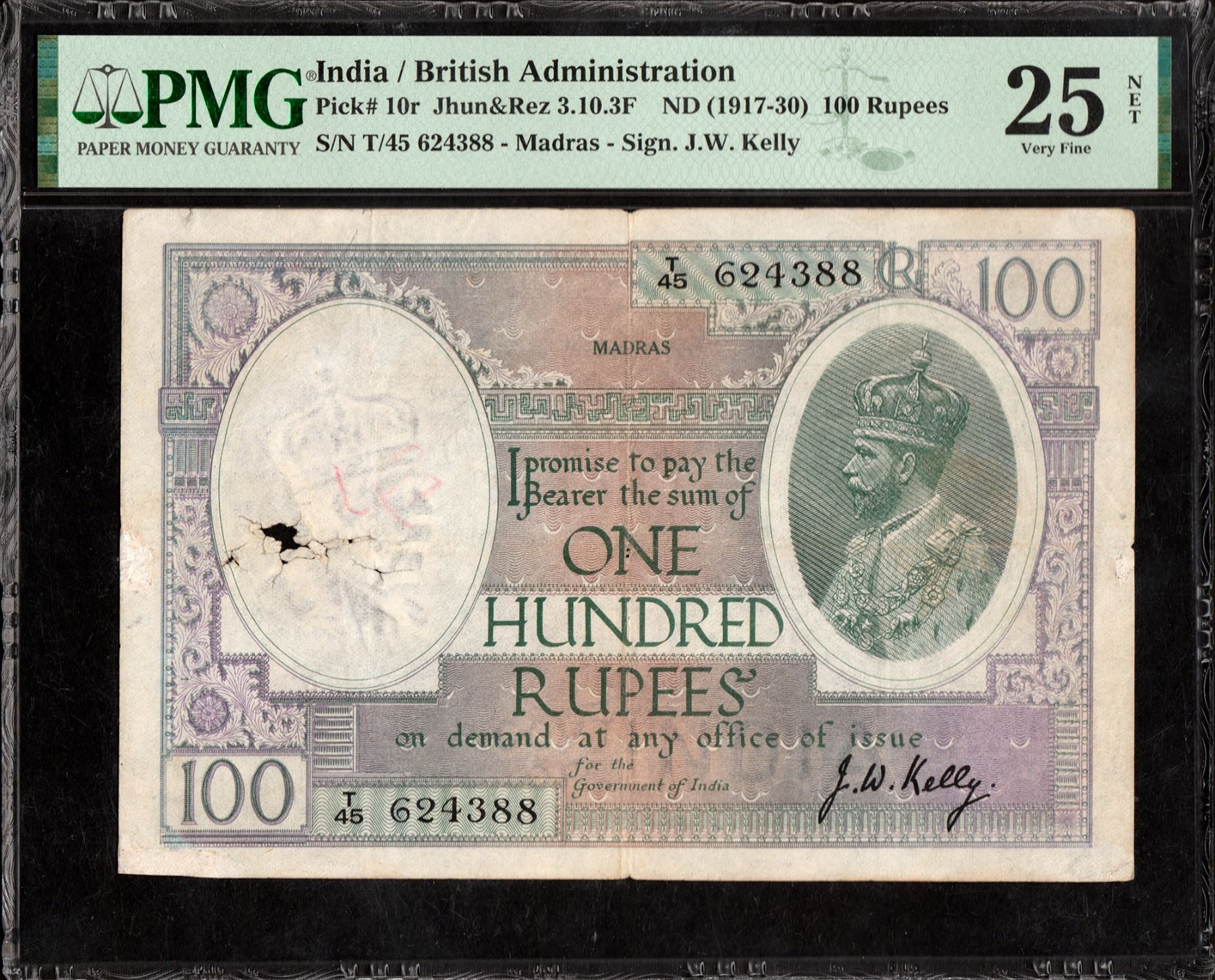 British India, 1928, King George V, 100 Rupees, Madras Circle, Signed by J.W. Kelly, T Prefix, S. No. T45 624388, (KJ & RR # 3.10.3F), holes, folds, stains, repaired, tears, graded by PMG as 25 Very Fine NET, Extremely Rare.