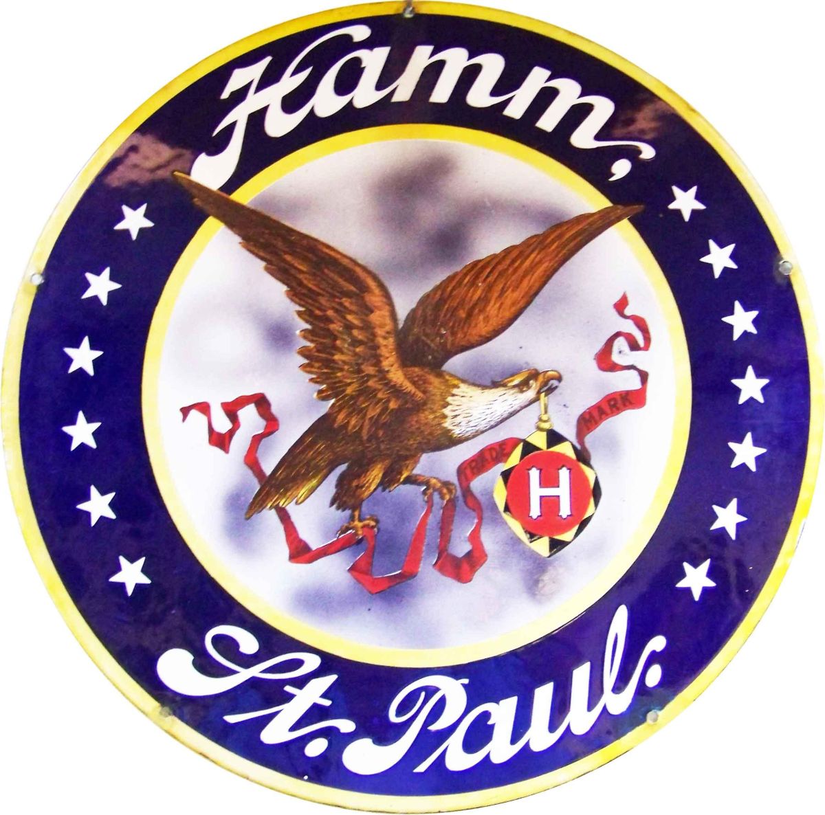 Extremely Rare Hamm's Beer Porcelain Sign, ca. 1910 St. Paul, MN. This sign was used on the top of barrels on beer wagons for parades. Some minor professional restoration otherwise very good condition. 18 inch diameter.