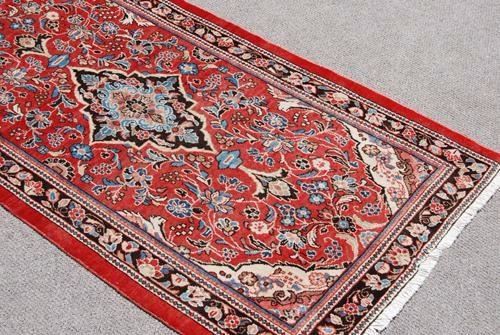 Extremely rare and hard to find investment quality hand woven semi-antique Persian Mahal, size 4.3 x 8 feet, made of 100% baby lamb's wool pile on cotton foundation, all natural vegetable dye, an extremely finely detailed intricate floral motif on a rich red background, stunning multi layered/multi colored teardrop centerpiece floral medallion, finely done leveled crowned corners and an intricate cream colored floral trim. A beautiful selection of colors were used in making this masterpiece Persian Mahal. Hand woven by a master Persian rug weaver. A very rare rug, as an authentic Persian Mahal at this size is extremely hard to find. Country of origin: Iran. Mahal Persian rugs are somehow the most desirable among Persian village weavings, as they appeal strongly to both experts and interior designers. As a result, the best Mahal antique carpets have become very difficult to find in the international market. Subtle, glowing pastels and earth tones is the main characteristics of Mahal. Many Mahals exploit these allover themes, while others present the central medallion format, seen often in other Persian carpet styles.