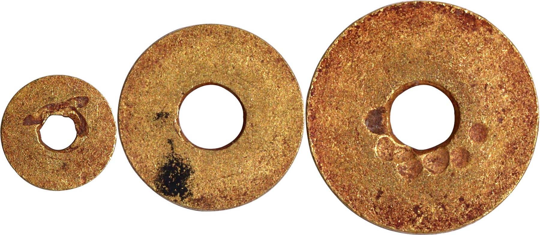 Harappan Primitive Money (3000-2500 BC), Indus Valley Civilization, Gold Disk (3), Group of 3 Disks, various sizes with a central hole, generally used for necklaces but allegedly also for trade, given the great variety of size & weight, known from excavations at Harappan sites, 0.07 to 0.31gms, 3.91 to 6.86mm, about very fine, Extremely Rare.