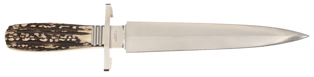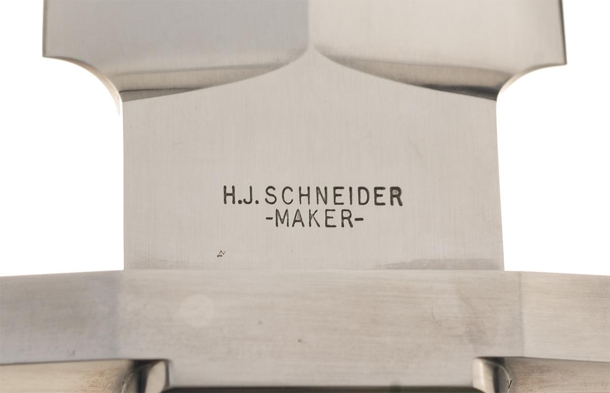 Handcrafted by legendary knifemaker Herman J. Schneider, this Arkansas Toothpick is featured in the 1982 Gun Digest Book of knives, second edition (page 75) and is the only Arkansas Toothpick that Schneider produced. The blade is 9 1/4 inches long with "H.J. SCHNEIDER / -MAKER-" on the ricasso. Stainless steel hilt with stag handle with six rivets. OAL: 14 1/4".