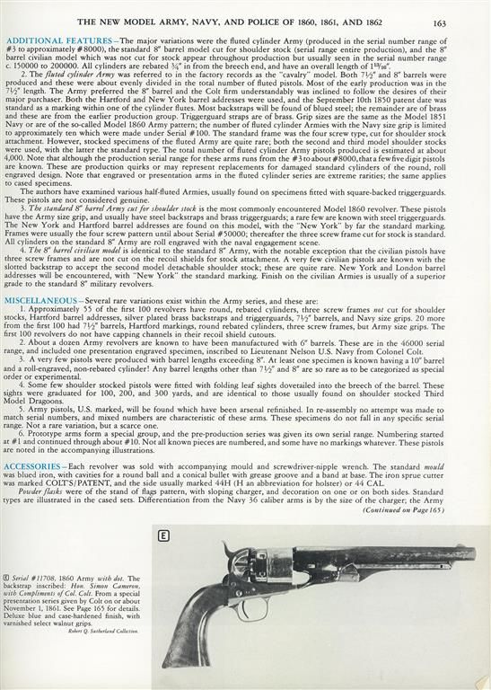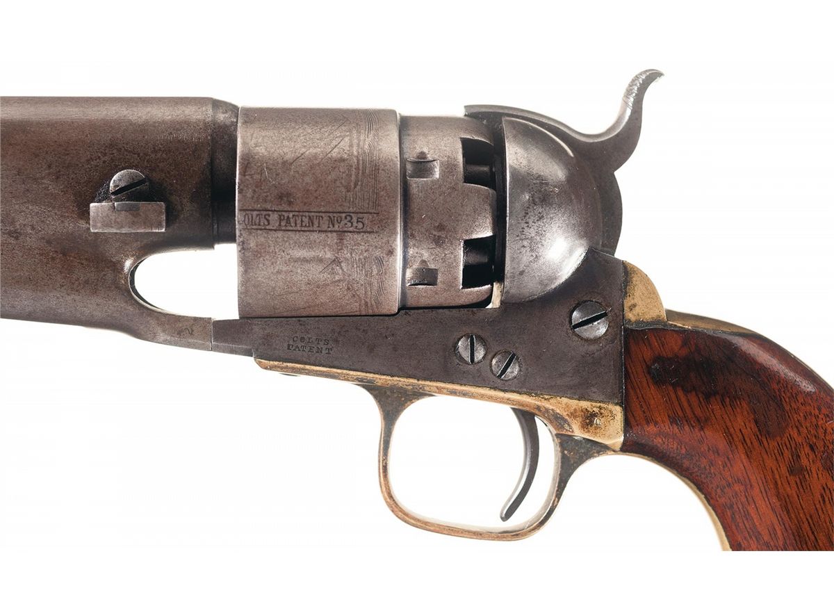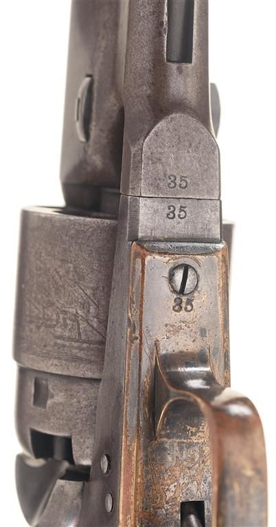 Rare variation of the first production M1860 Army Revolver, serial number 35. This extremely rare revolver has M1851 Navy size grips, three-screw frame with no capping groove and no shoulder stock cuts, silver-plated brass trigger guard and back strap, 7 1/2-inch barrel and round rebated cylinder. In THE BOOK OF COLT FIREARMS, author R.L. Wilson states, "Several rare variations exist within the Army series, and these are: 1. Approximately 55 of the first 100 revolvers have round rebated cylinders, three screw frames NOT cut for shoulder stocks, Hartford barrel addresses, silver plated brass back straps and trigger guards, 7 1/2" barrels and Navy size grips." He further notes that "The first 100 revolvers do not have capping channels in the recoil shield cutouts." An identical revolver (serial number 5) is pictured on page 158 of THE BOOK OF COLT FIREARMS. The barrel, cylinder, frame, hammer and loading lever have the standard Colt blue and case-hardened finish. The cylinder is roll-engraved with the Texas Navy battle scene and "COLT'S PATENT NO." markings. "COLTS/PATENT" is roll-stamped on the left side of the frame. The left side of the trigger guard is stamped with a small "G" Colt inspection mark and the left side of the trigger guard bow is stamped with a small "B". The Colt address has been neatly removed from the top of the barrel. The serial number "35" is stamped on the barrel, frame, trigger guard, back strap, cylinder and, unusually, the top of the loading lever. All of the visible serial numbers match.