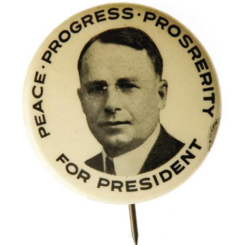 <B>Extremely Rare James M. Cox Button.</B></I> An elusive 1 1/4" pinback eagerly sought by serious collectors of 20th century political memorabilia. Large portrait buttons showing Cox, 1920s unsuccessful Democratic presidential candidate, are extremely difficult to locate. This splendid example is marked by the maker, Basitan Brothers of Rochester, NY. Excellent condition.