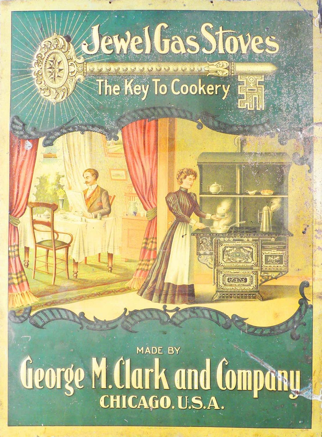Extremely Rare Jewel Gas Stoves Embossed Tin Sign. George M. Clark and Company Chicago, USA. The Tuscarora Advertising Company, Coshocton, Ohio Lithographers. The only one we have ever seen. Dents, wrinkles, scratches and rust otherwise fair to good condition. 17 1/2 X 24 inches.