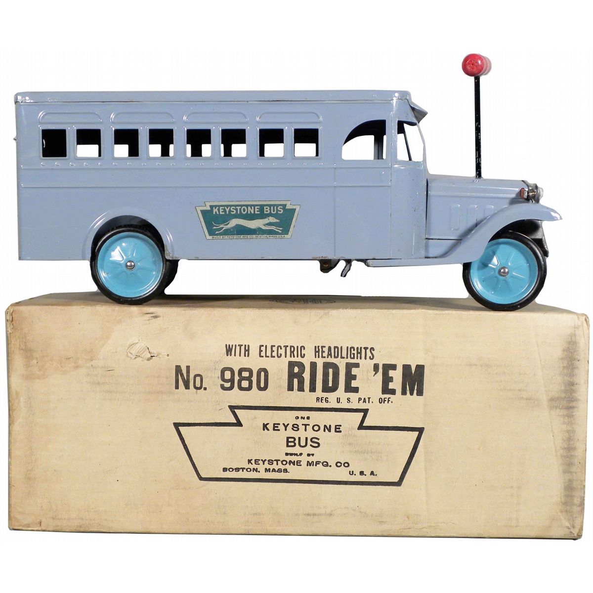 Extremely Rare Keystone No. 980 Ride 'Em Greyhound Bus. Keystone Mfg. Boston, Mass. This rare toy has electric headlights. All original, mint condition in the box w/battery. 22 1/2 inches long.