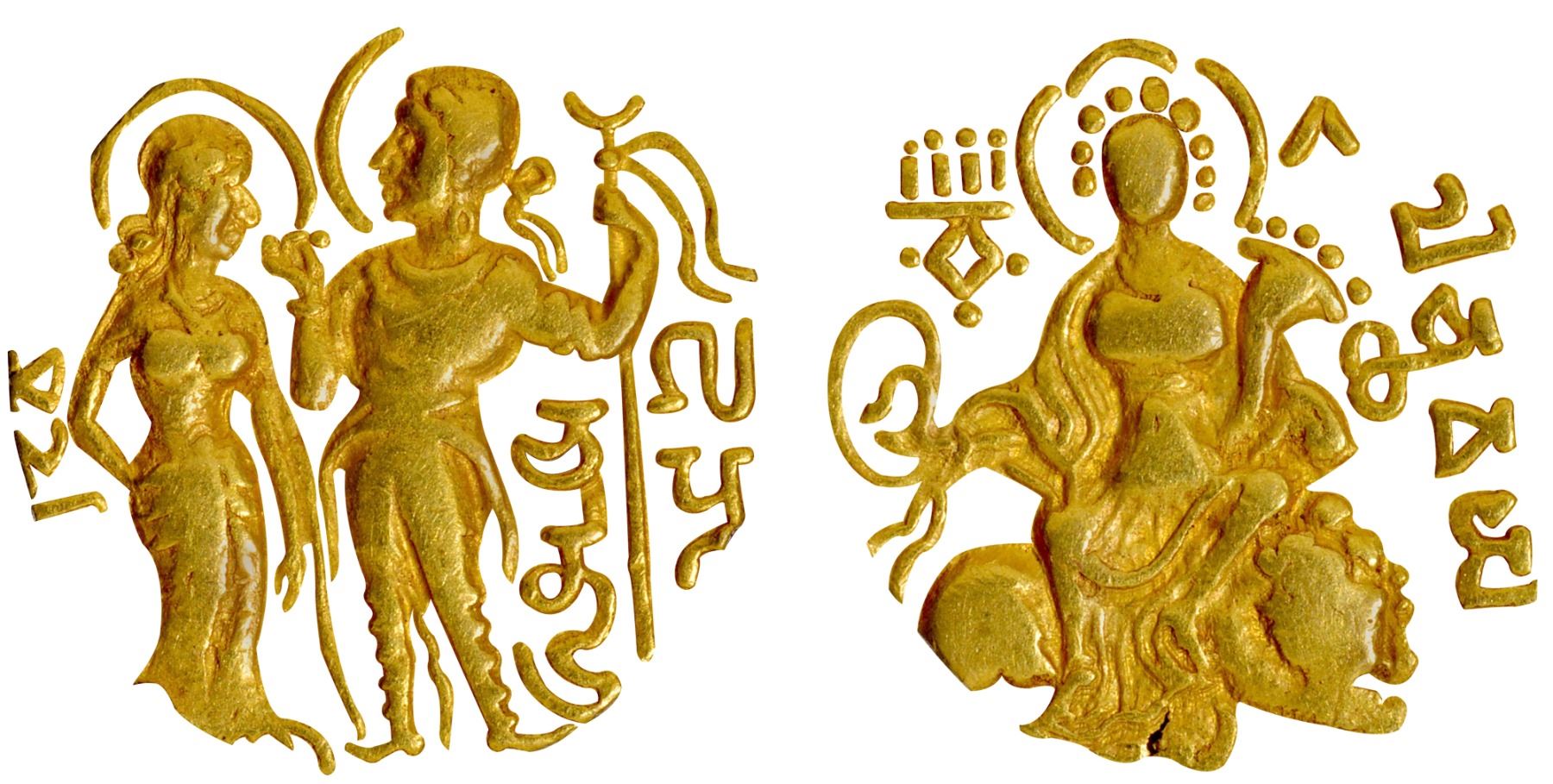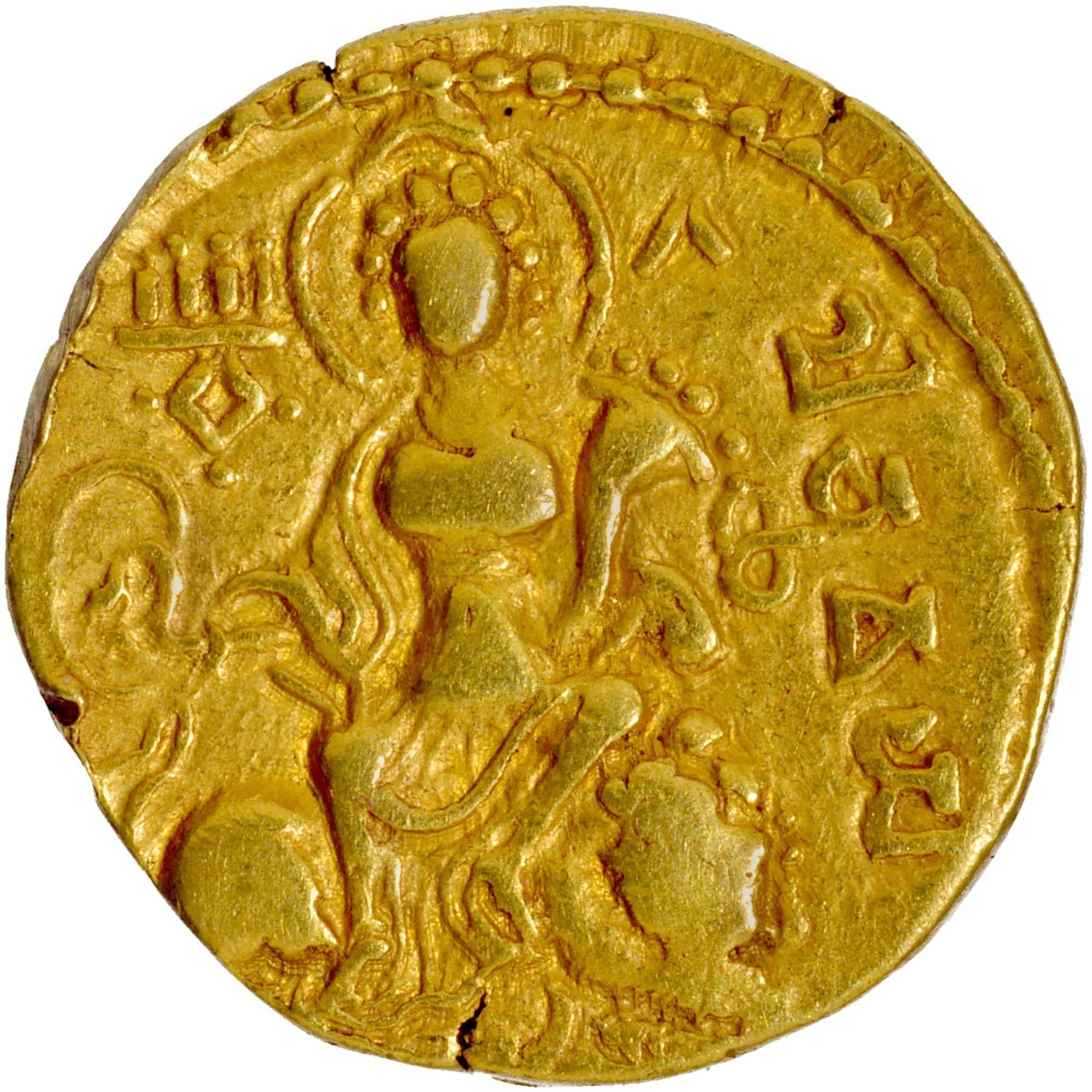 Gupta Dynasty, Samudragupta (335-370 CE), Gold Dinar, "King and Queen- Vamardhaparyanka" type, issued in the memory of his parents Chandragupta I and Kumaradevi, Obv: the king, nimbate, diademed, standing to the right facing, the queen stands in tribhanga pose on the left, the king offering a ring/flower to the queen, both have a halo over their heads, the Brahmi legend "Kumaradevi Shri" partially visible in the left field behind the queen, "Chandra" and "Gupta" in the right field divided by a crescent standard which is held in the king's left hand, the king has a dagger on a belt at his right side, Rev: the goddess Durga seated in the Vamardhaparyanka pose on a recumbent lion facing right, holding a cornucopia and a pasha, a tamgha on the left field, the Brahmi legend "Lichchhavayah" on the right field and a dotted border around the field, 7.42g, 20.44mm, (Variant of BMC # Pl. III-15/TGE, S. Kumar # Class I-Var. B.1), very attractive, sharp features, choice quality, XF-AU, Extremely Rare.