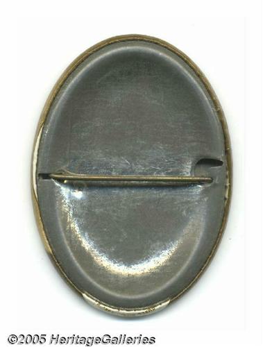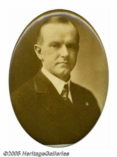 <B>Extremely Rare Large Calvin Coolidge Oval Pin</B></I> Listed in the original 1896-1972 Hake book as COO-88, it is actually a 1920 Vice Presidential item, rather than a 1924 issue, as it exactly matches a Warren Harding version, HAR-71. Some hobbyists have at times confused these with another series, issued in both round and oval shapes, showing the presidents up through Herbert Hoover, and presumably issued around 1930. The present example, however, is a completely different animal. The Harding mate, from a different collection, fetched over $1,500 in the Slater's Americana July 2004 sale. It would not surprise us if this Coolidge mate surpassed that level because of its distinguished provenance and Vice Presidential connection (a popular collecting specialty), and because historically Coolidge material has performed better in the marketplace than Harding. Great condition. Height 2 3/4 inches. Lot:262