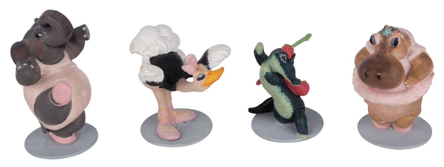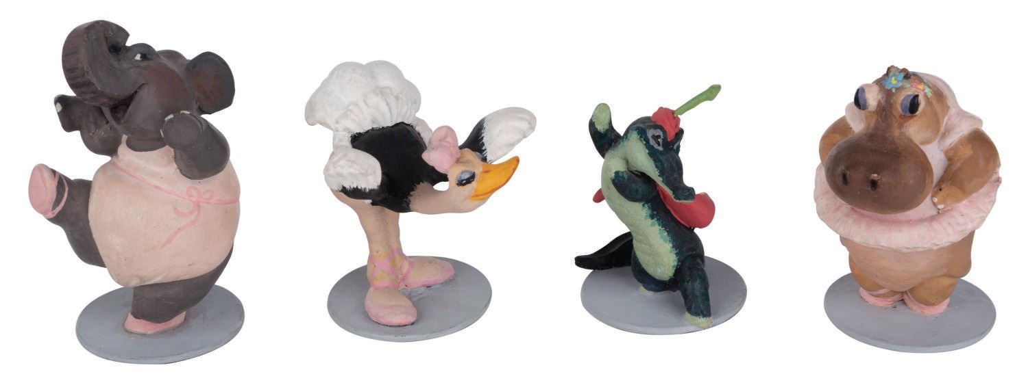 (Disney, 1940) An extremely rare set of four miniature maquettes produced in the Model Department at the Disney Studio during the production of "Fantasia." In order to get a better idea of how to choreograph and light the "Dance Of The Hours" sequence, the model department built a miniature stage and populated it with these miniature figures. The model and figures assisted animators in recreating lighting as it would appear on a real stage. Hand-painted with painstaking detail, the figures range between 2.25" and 3" tall. Each one is mounted to a metal base. All four are in fine condition with light wear and soiling. An incredibly rare set and a fascinating part of Disney Studio Animation history.