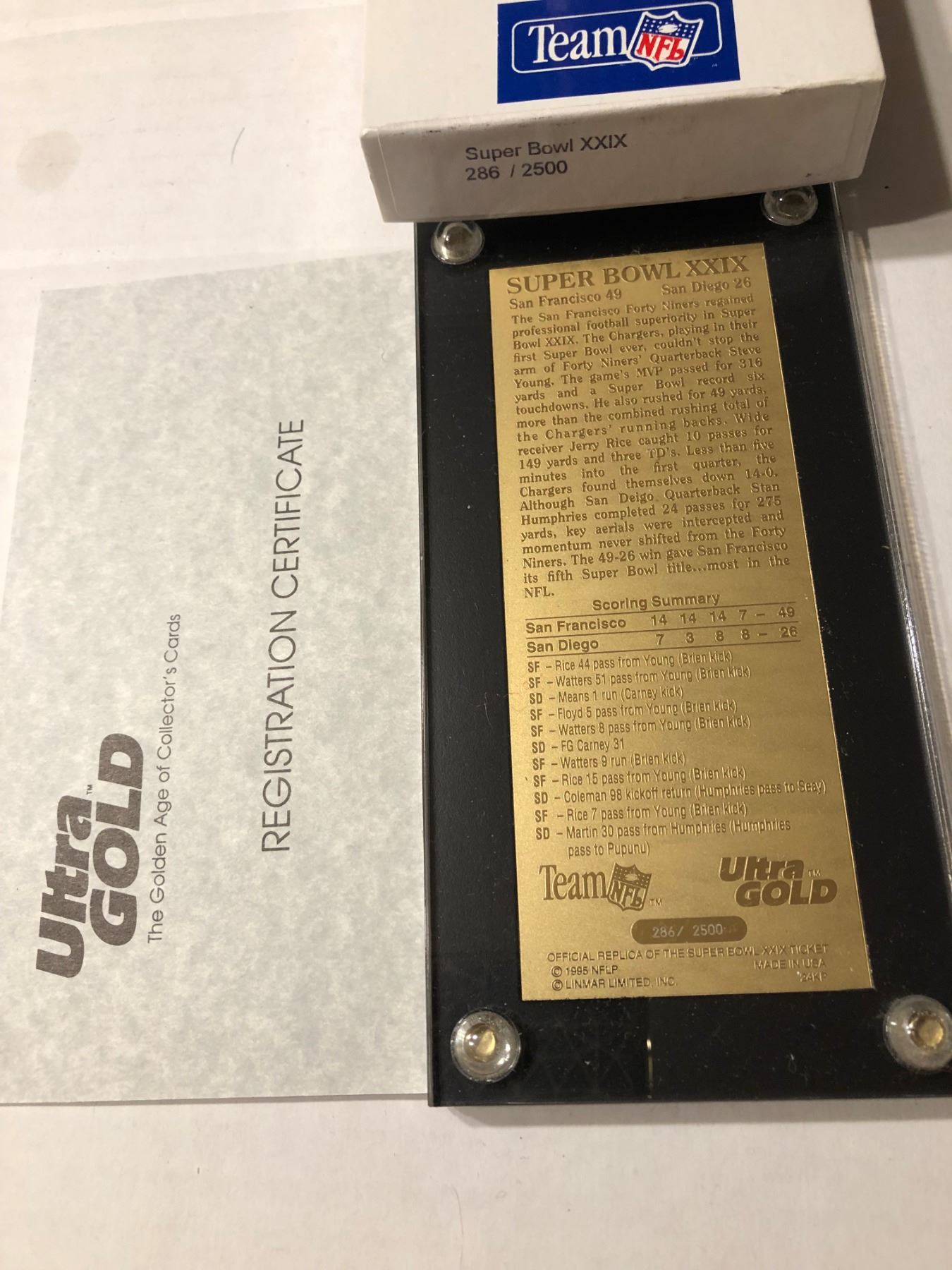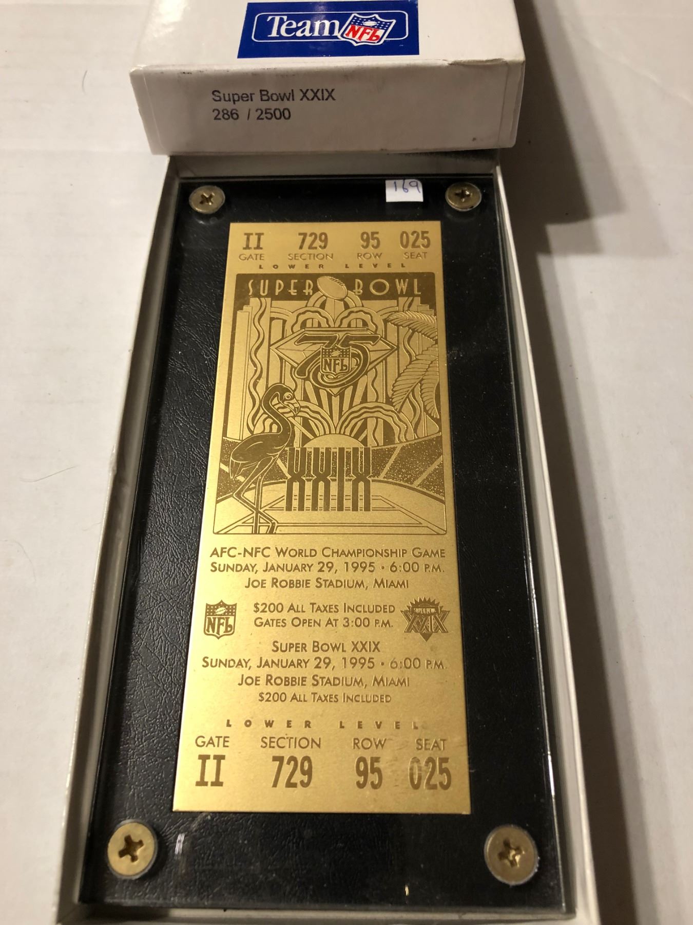 Extremely Rare Limited Edtion 286 of 2500 Gold Super Bowl XXIX Ticket in Original Box