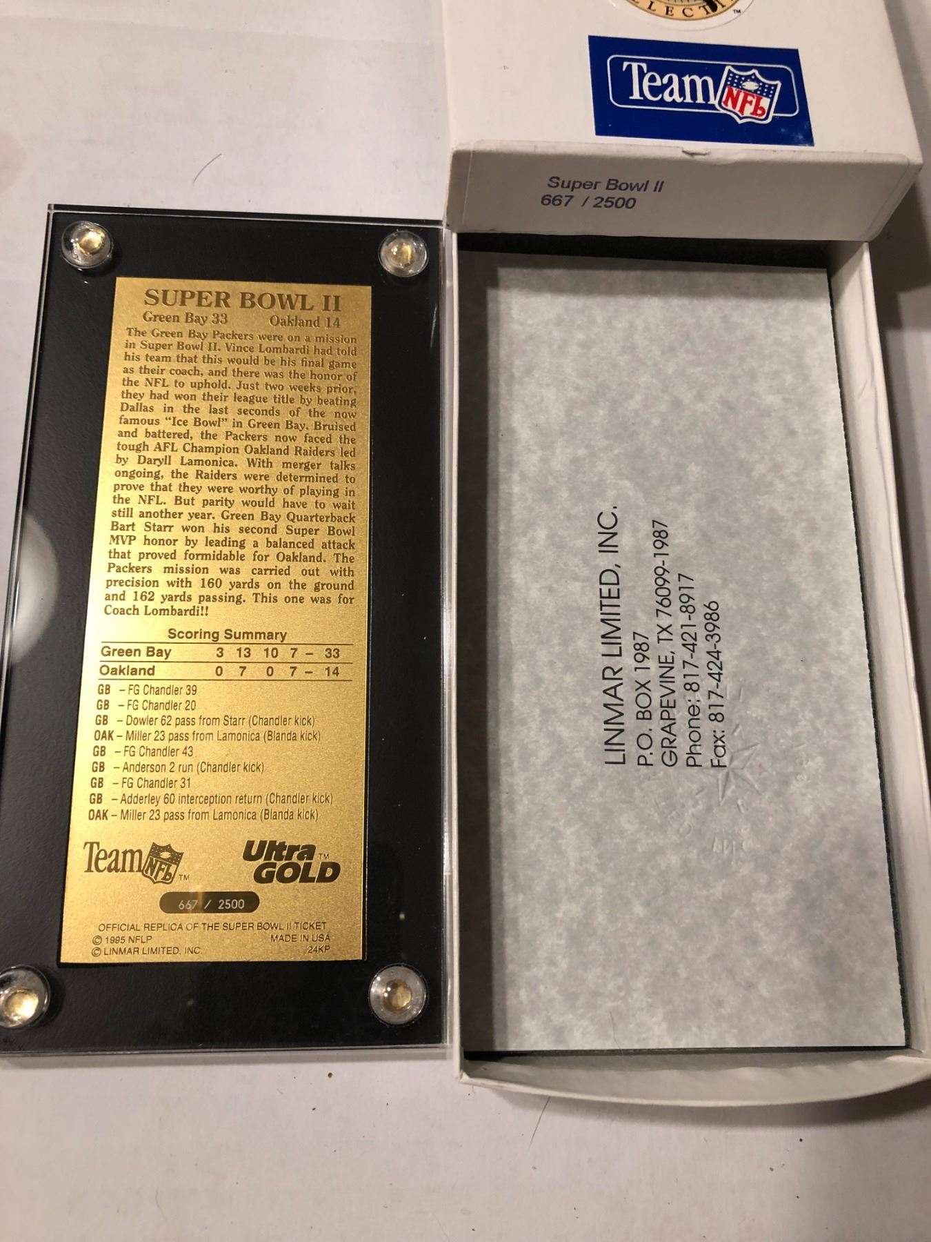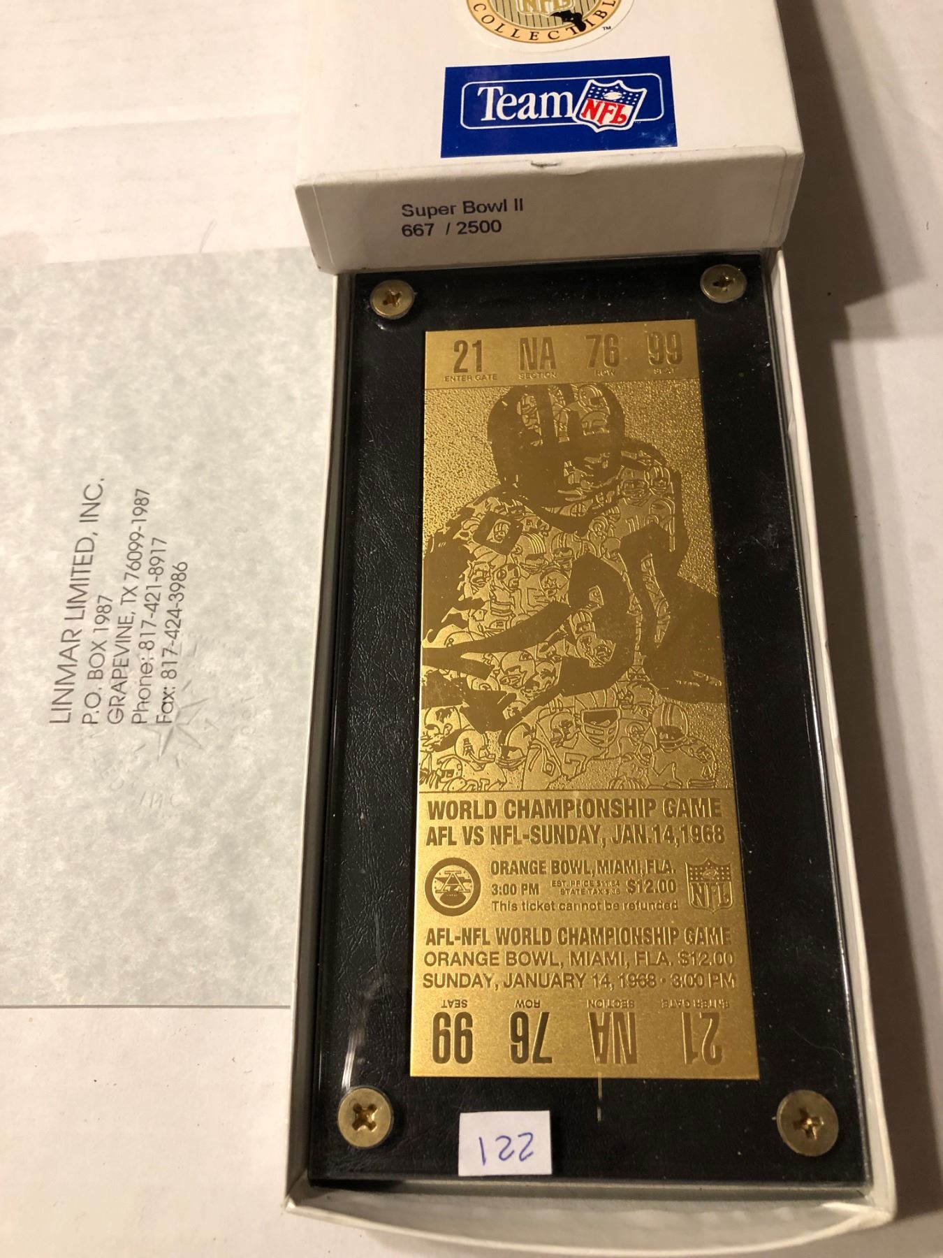 Extremely Rare Limited Edtion 667 of 2500 Gold Super Bowl II Ticket in Original Box