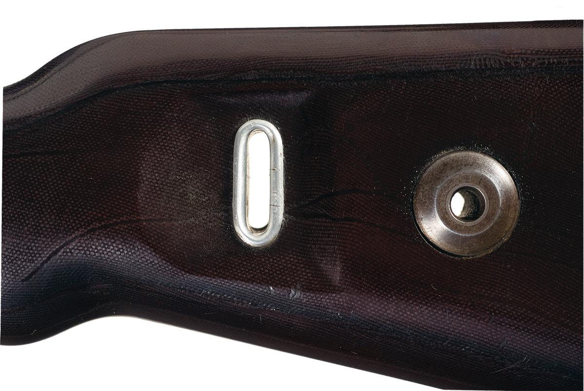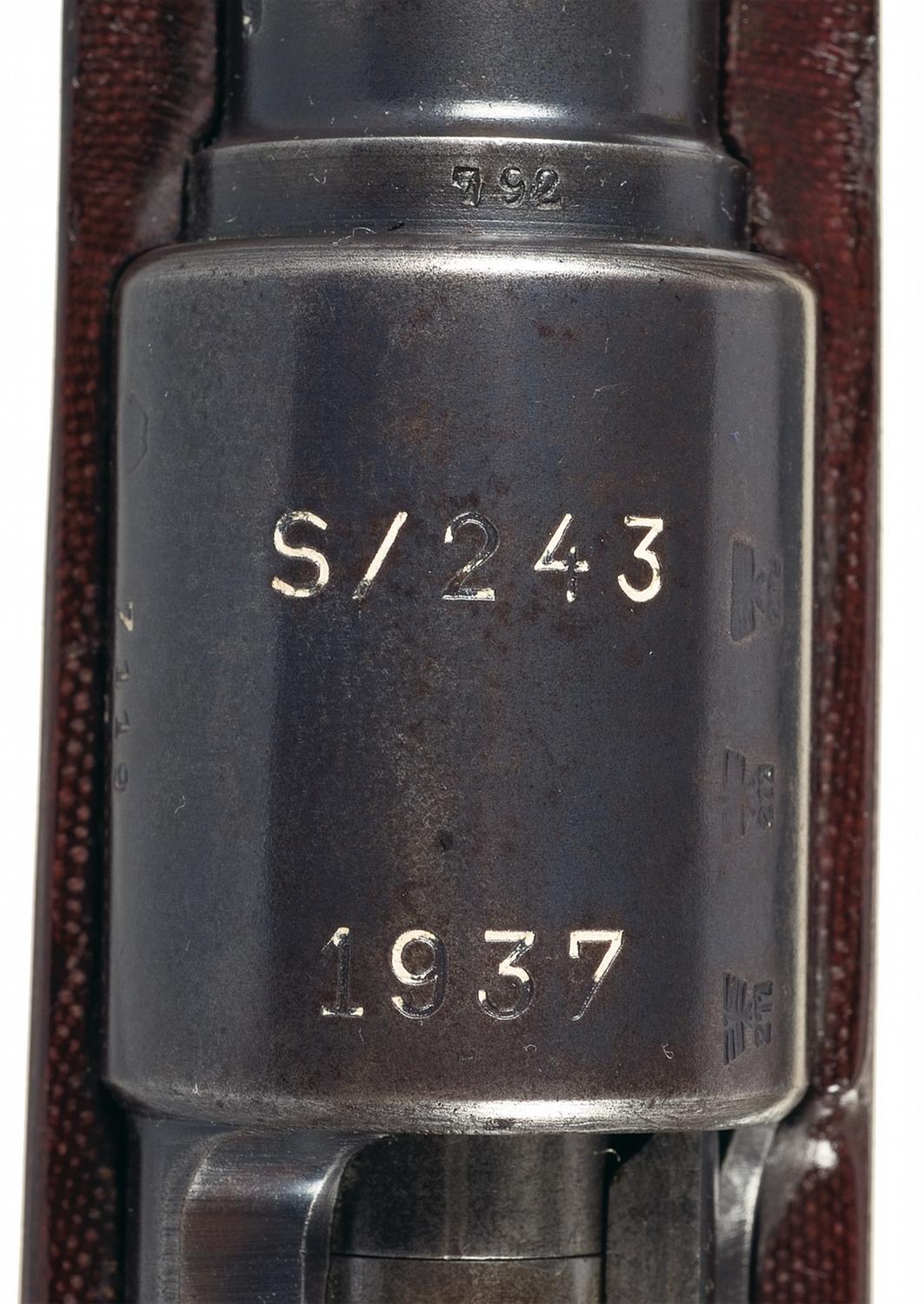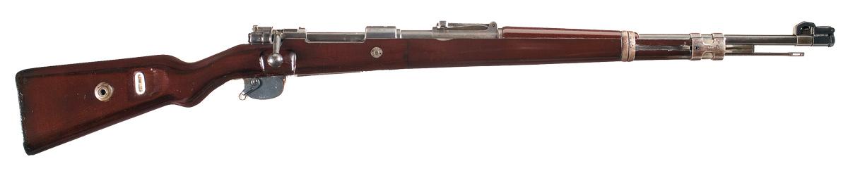 This is an excellent example of a early Mauser rifle with the ultra-rare fiberglass stock. These stocks have been noted in several of the recent K98 Mauser reference book and are considered just about the rarest of the WWII Mauser rifle variations. They were produced on a very limited basis as an experimental stock for early troop test trials. They didn't prove as robust as the standard walnut and laminated stocks, consequently they were produced in very limited numbers and are extremely rare to find today. The rifle itself is a very early prewar K98 that was produced at the Mauser Werkes factory in Borsigwalde, Berlin. The top of the receiver has the large "S/243" over "1937" markings indicating the Mauser factory. The left and right sides of the receiver have the correct Eagle 211 proofs with the receiver side wall being marked "MOD 98" with firing proofs on the barrel and receiver. It has the early all milled components with the correct Eagle WaA211 proofs and the early style "H" pattern front barrel band. The stock and hand guard are the original wartime fiberglass or composite version in which you can actually see the red layered fiberglass material with the seam in the middle of the forend where the two sections (forend and butt stock) were jointed together. The stock still retains the original bolt take down washer in the middle of the butt stock and it is equipped with the original flat butt plate. The left side of the stock has the original Eagle "H" Heers proof with a double Eagle WaA211 proof directly below that. The underside of the stock is correctly marked with the rifle serial number. This is a factory original stock, with the detail quality of the sling slot and adjoining plate of the buttplate being of particular note. It is complete with an original cleaning rod, a metal push on front sight cover, a later winter trigger assembly that is marked with "MOD 98" on the side and a later reproduction leather sling.