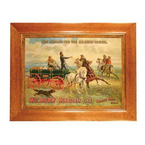 Extremely Rare Milburn Wagon Co. Embossed, Self Framed, Tin Sign. Entitled The Demand for the Milburn Wagon. Toledo, OH. Sentenne and Green Co. Lithographers, NY. You want exceptional graphics, here it is. A few nail holes across the top have been repaired otherwise very good condition. In period oak frame. 27 3/4 X 19 3/4 inches image only.