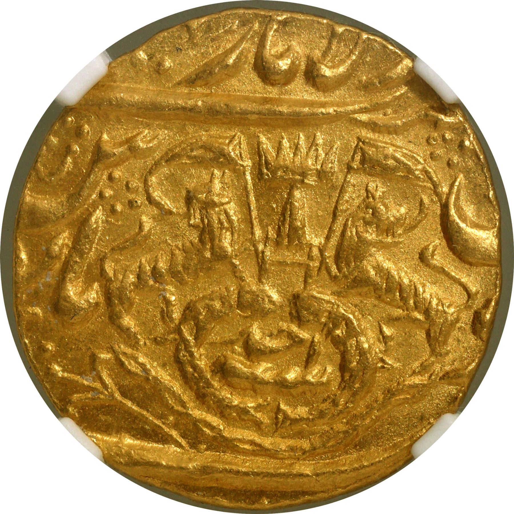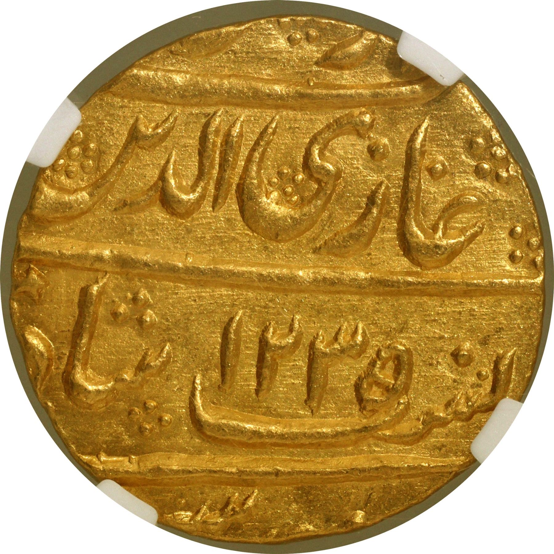 Awadh State, Ghazi ud-din Haider as King (AH 1234-1243/1819-1827 AD), Suba Awadh Dar-ul-Amarat Lakhnau Mint, Gold Mohur, AH 1235/ Ahad RY, Obv: Persian legend "sikka zad bar seem-o-zar az fazle rab zu'l manan, Ghazi-ud-din haider aali nasab shah-e-zaman", Rev: Persian legend "Dar ul Amarat Lakhnau, zarb Suba Awadh sana ahad julus", crown flanked by lions holding flag, two upright fish below, (KM # 170.1, Unlisted in MK), superb quality, graded & slabbed by NGC as MS63, Extremely Rare.