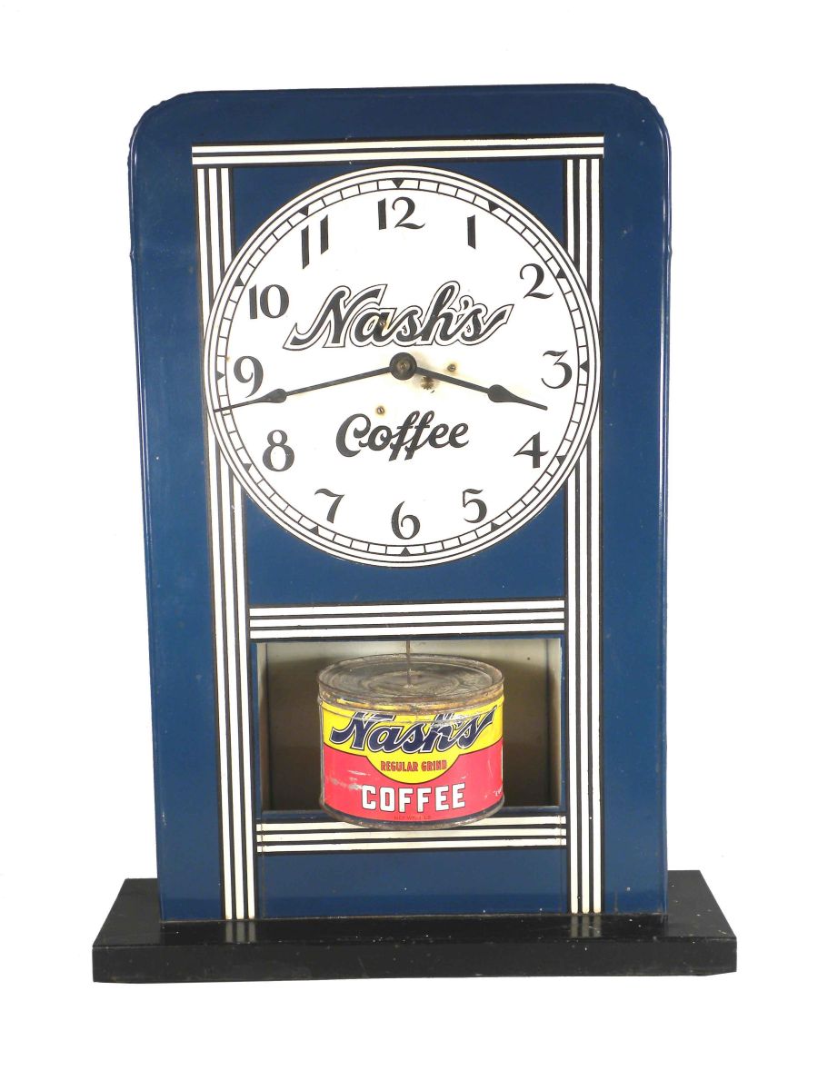 Extremely Rare Nash's Coffee Clock, tin with coffee candy and rotating pendulum. Original paper decal. Theim Mfg. Co, Minneapolis, MN. Very good all original condition. 17 X 23 1/2 inches.