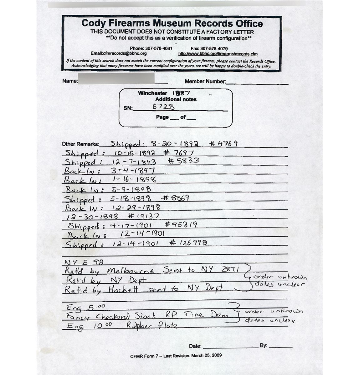 This is an extremely rare and fine Factory Ulrich Engraved Deluxe Winchester Model 1887 Lever-Action Shotgun that is documented with a Cody Firearms Museum letter. The letter describes this shotgun as 12 gauge with a 30-inch, "fine Damascus barrel, fancy checkered stock", rubber buttplate and $10.00 engraving and states that it was shipped from Winchester on March 26, 1888. The letter states that the shotgun was returned to Winchester on several occasions between 1892 and 1901 and had $5.00 (added) engraving on April 17, 1901. (Writer believes all of the aforementioned details point to this being a factory display sample.) Winchester records indicate that only five Model 1887 shotguns were factory engraved. The shotgun is also pictured and documented in Ronald W. Stadt's book "WINCHESTER SHOTGUNS AND SHOTSHELLS" (pages 14-15). Stadt observes that the shotgun is "a truly remarkable piece, stunningly artistic by any standard" and states, "It is likely the most ornate Model 1887 extant.". The shotgun has a 30 inch Damascus barrel with a brass bead. The five-shot magazine has a commercial blue finish. The receiver and lever are color casehardened. The stock and forearm panels are highly figured fancy grain walnut with a high polish piano finish. The distinctive two-piece forearm has two diamond-shaped checkered panels on either side and the stock has checkered panels on the pistol grip and a black checkered hard rubber buttplate with the round Winchester logo in the center. The left side of the receiver is roll-stamped with the "WRA Co" monogram. The serial number "6728" is stamped on the underside of the receiver ahead of the lever cut-out. The underside of the lower tang is roll-stamped "MANUFACTURED BY THE/WINCHESTER REPEATING ARMS CO./>NEW HAVEN. CONN. U.S.A.</PAT. FEB 16. & JUL. 20. 1886." The right side of the receiver features a round engraved panel surrounding an upland game panel scene with a hunter, a dog on point and flushed game birds. The left side of the receiver is engraved with fine English style scrollwork surrounding the "WRA Co" monogram. The game scene and the monogram as well as the edges of the receiver have ribbon engraved borders. The delicate scrollwork covers the top of the receiver and breechblock, the upper tang, the sides and bottom of the lever and the underside of the receiver.