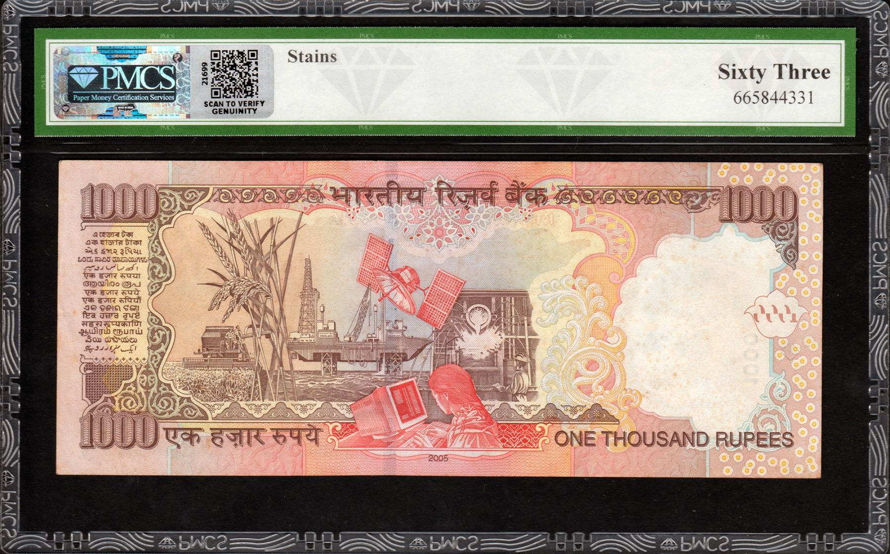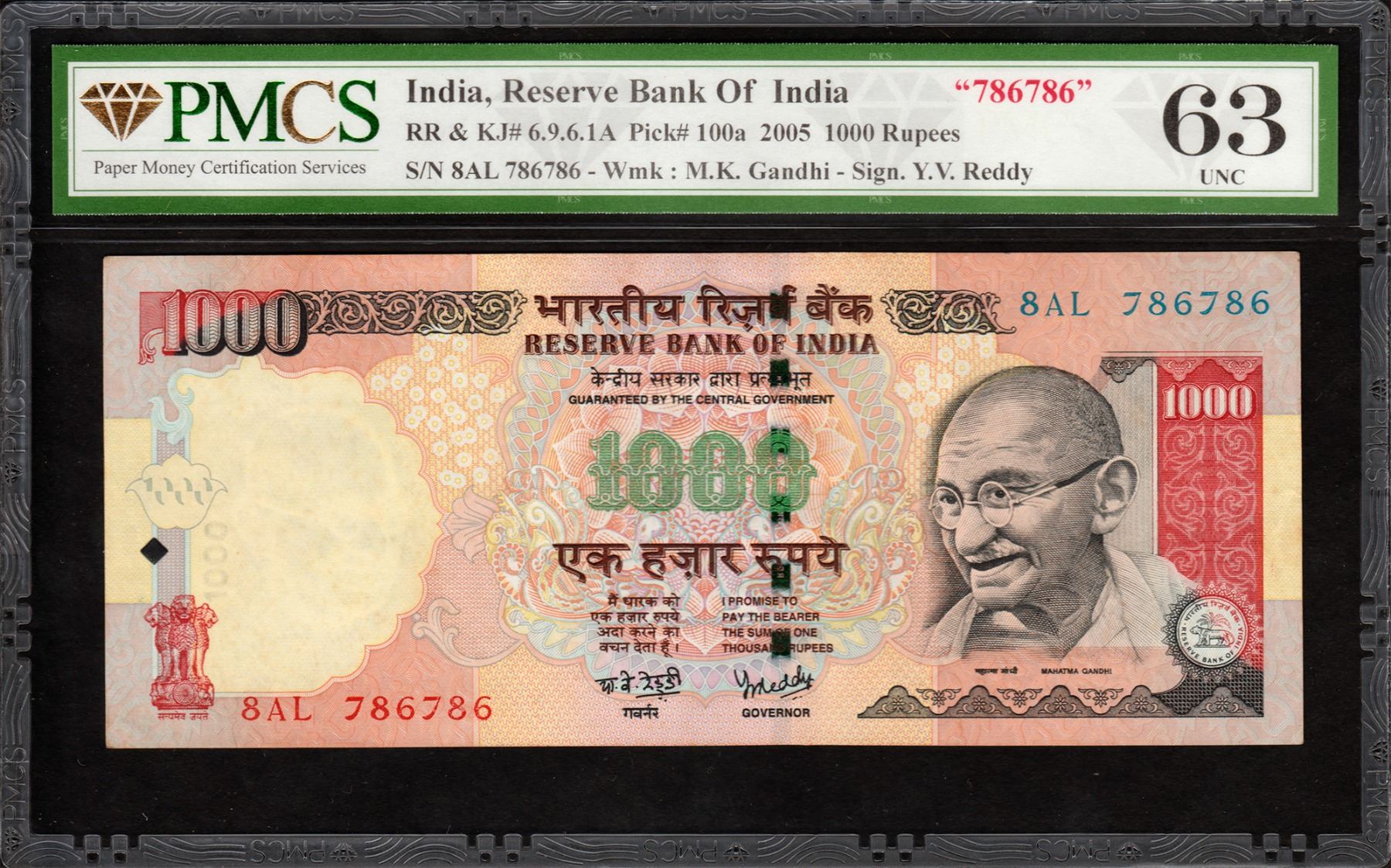Republic India, 2005, 1000 Rupees, 786786, Fancy Number, Signed by Y.V. Reddy, Plain Inset, AL Prefix, S. No. 8AL 786786, stains, graded by PMCS 63 UNC, Extremely Rare.